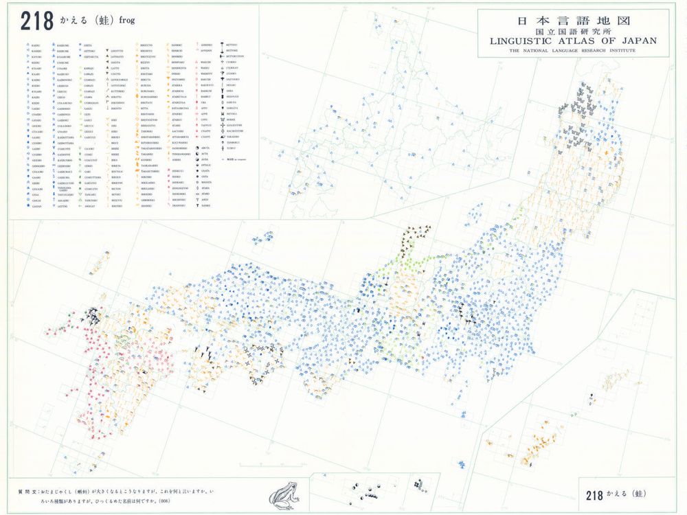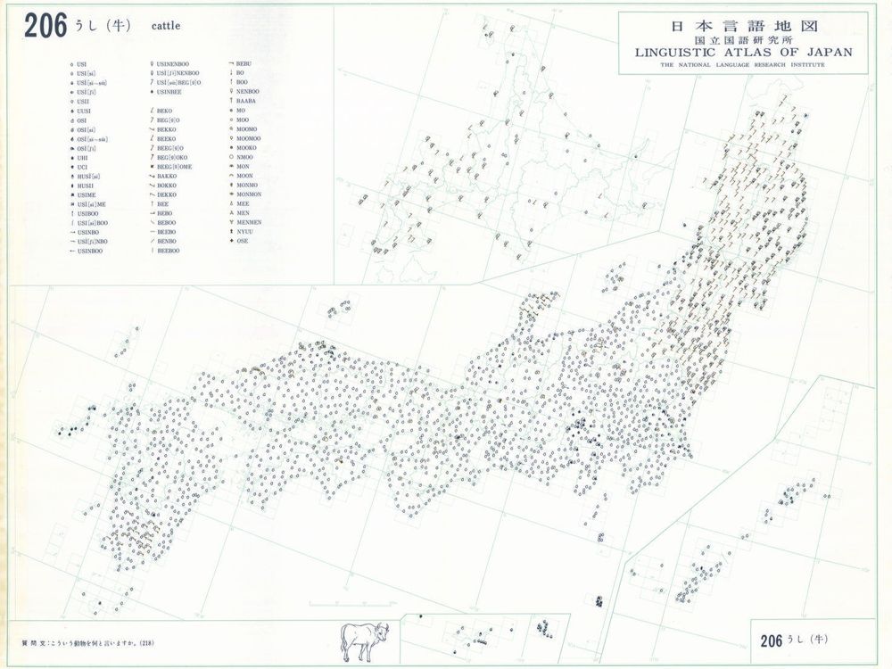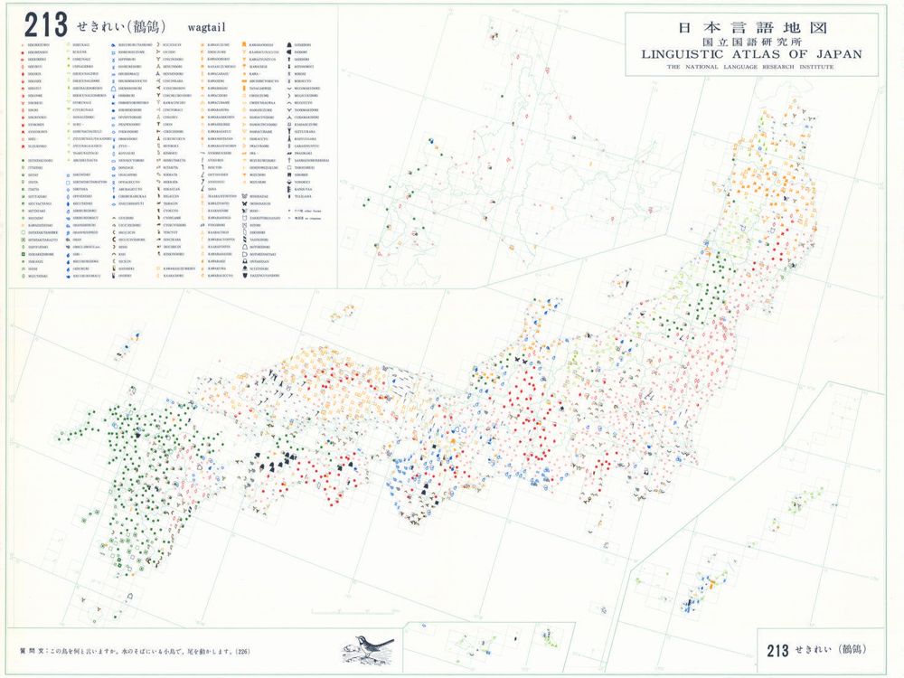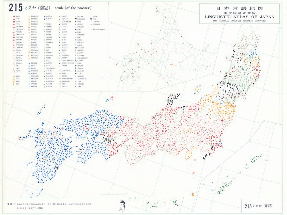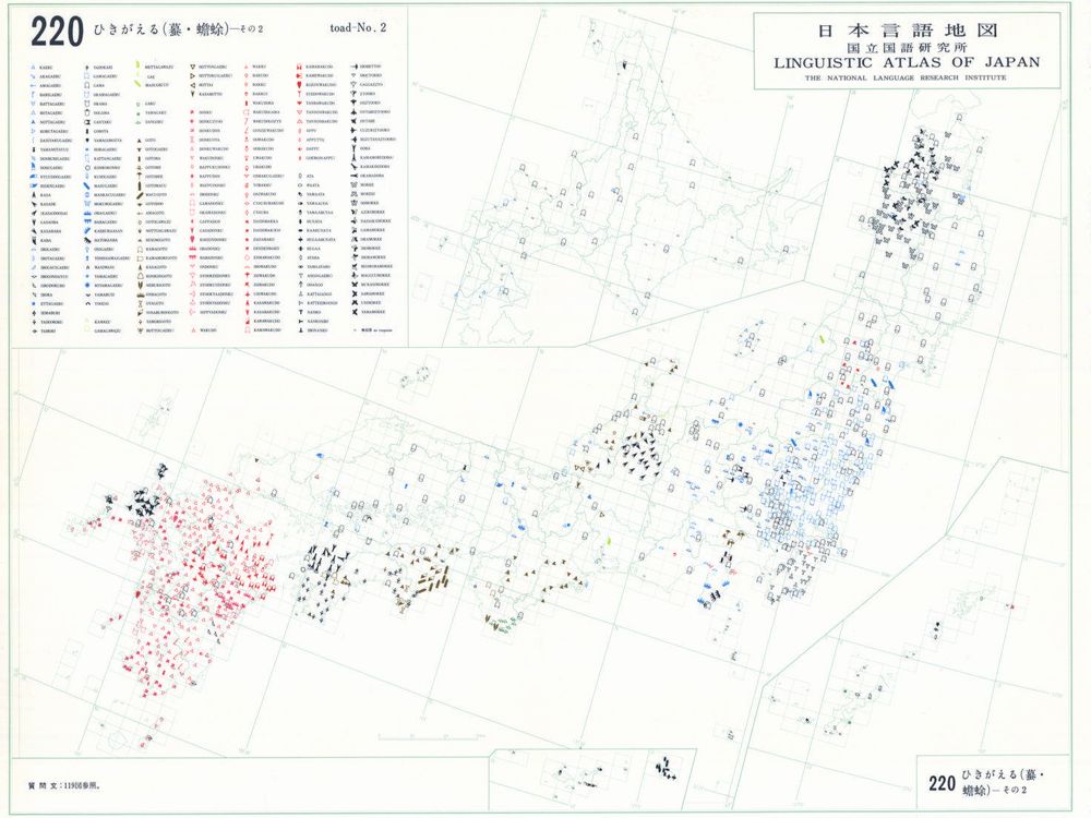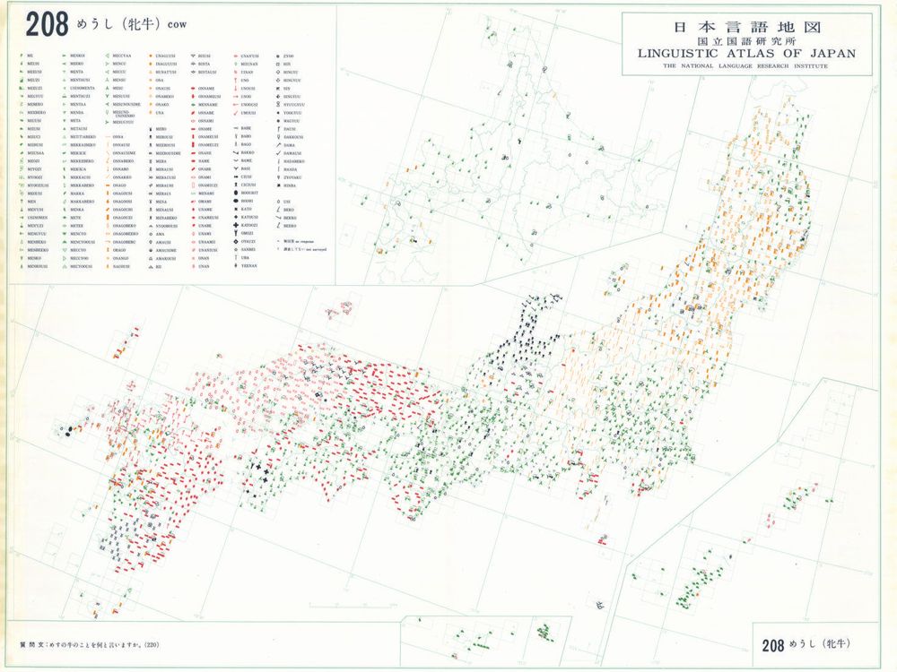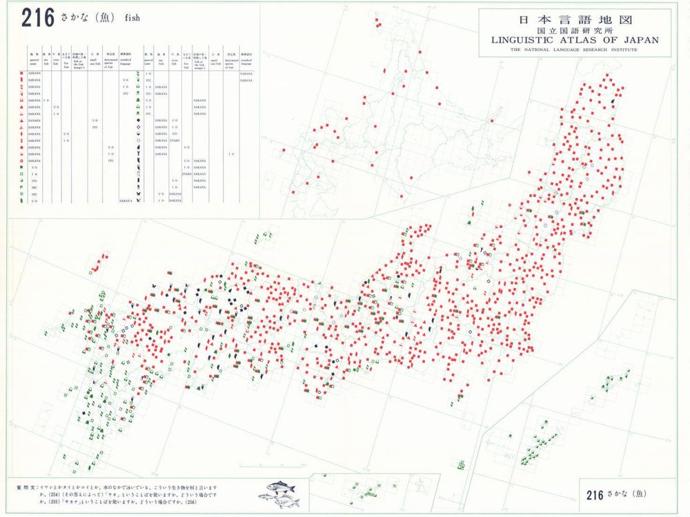 『日本言語地図』は、全国各地の方言で、どのような語形や発音がどこに現れるかを項目ごとに表示した地図で、1966年から1974年にかけて全6巻(言語地図300枚、参考地図6枚、各図解説)が刊行された。『日本言語地図』作成のための現地調査は、1957年から1965年にかけて、全国2,400か所にわたり、国立国語研究所員と同地方調査員によって実施された。言語地理学的手法によって、現代日本標準語の成立過程や、各種方言語形の歴史の解明を目指して作成され、全国の方言の地理的分布を一望できる日本の方言に関する基礎資料である。