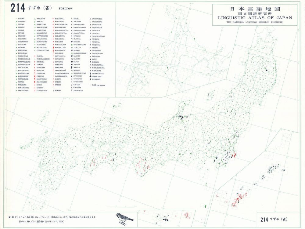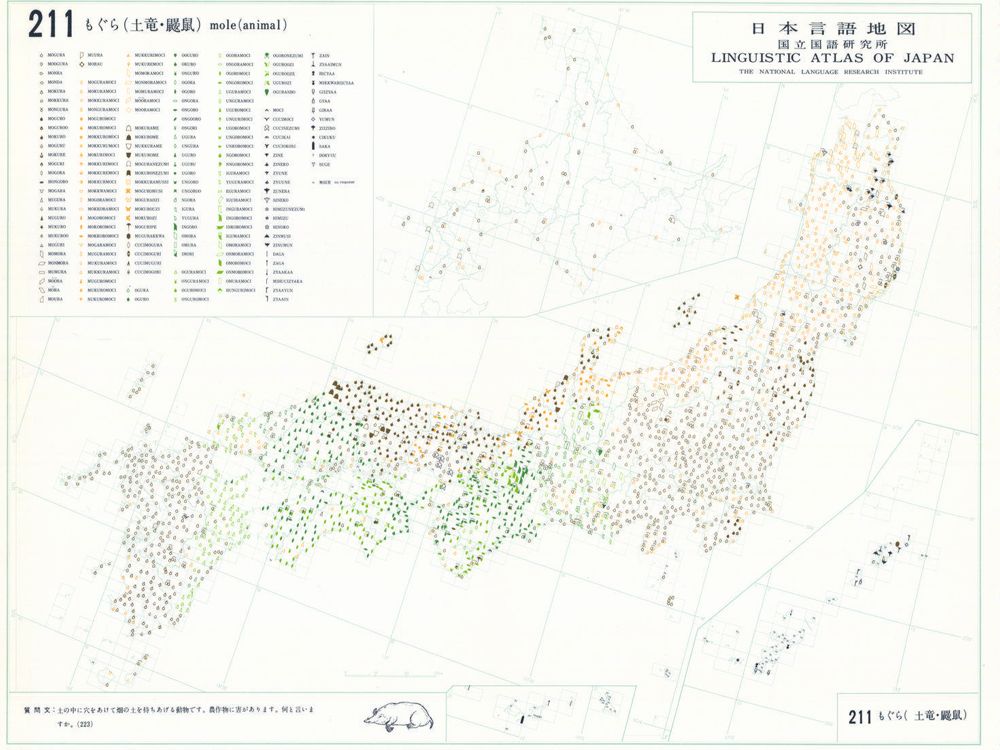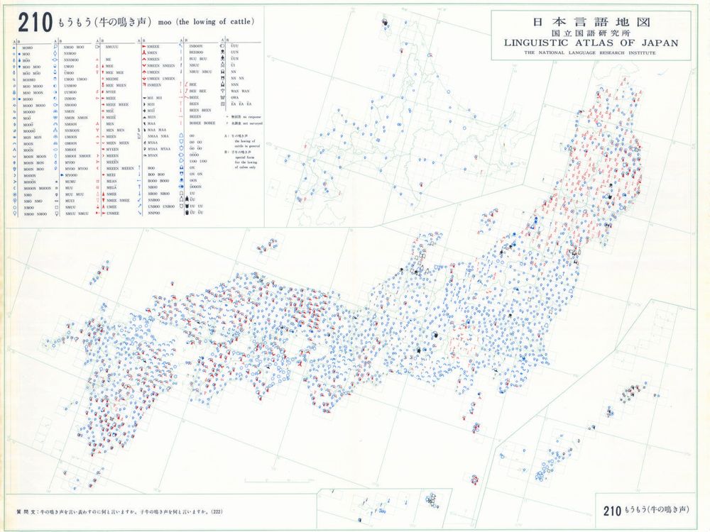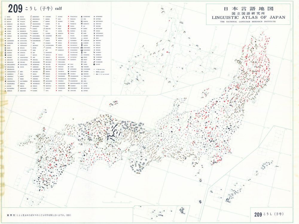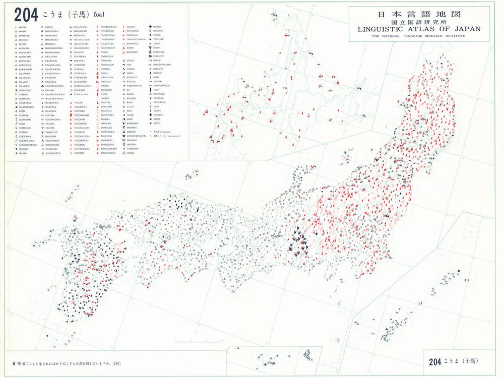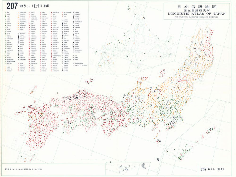 『日本言語地図』は、全国各地の方言で、どのような語形や発音がどこに現れるかを項目ごとに表示した地図で、1966年から1974年にかけて全6巻(言語地図300枚、参考地図6枚、各図解説)が刊行された。『日本言語地図』作成のための現地調査は、1957年から1965年にかけて、全国2,400か所にわたり、国立国語研究所員と同地方調査員によって実施された。言語地理学的手法によって、現代日本標準語の成立過程や、各種方言語形の歴史の解明を目指して作成され、全国の方言の地理的分布を一望できる日本の方言に関する基礎資料である。