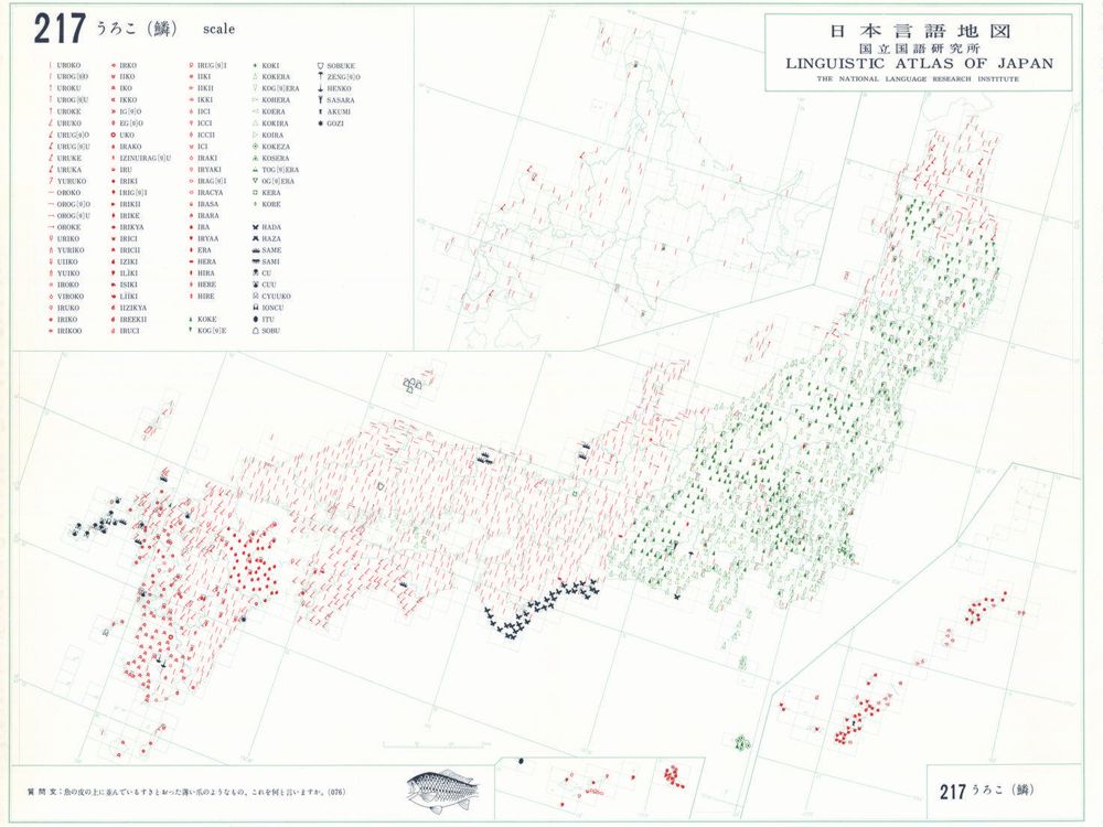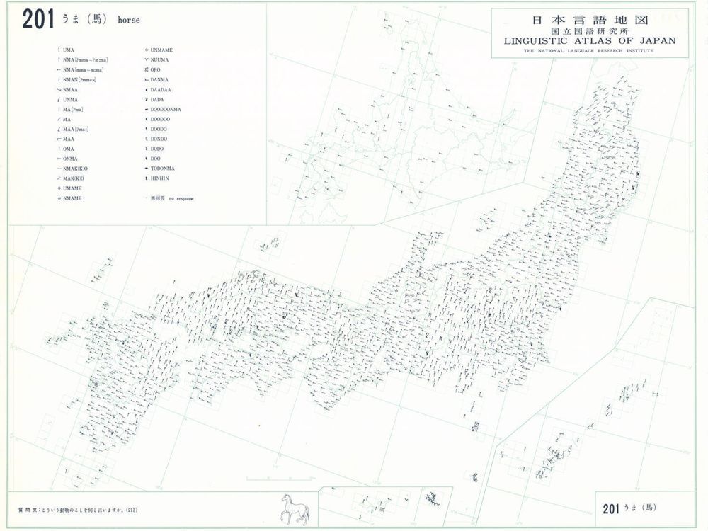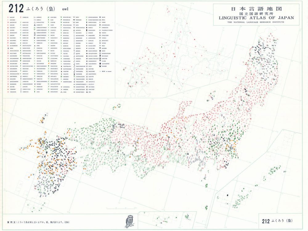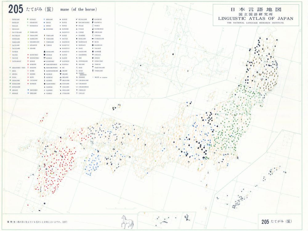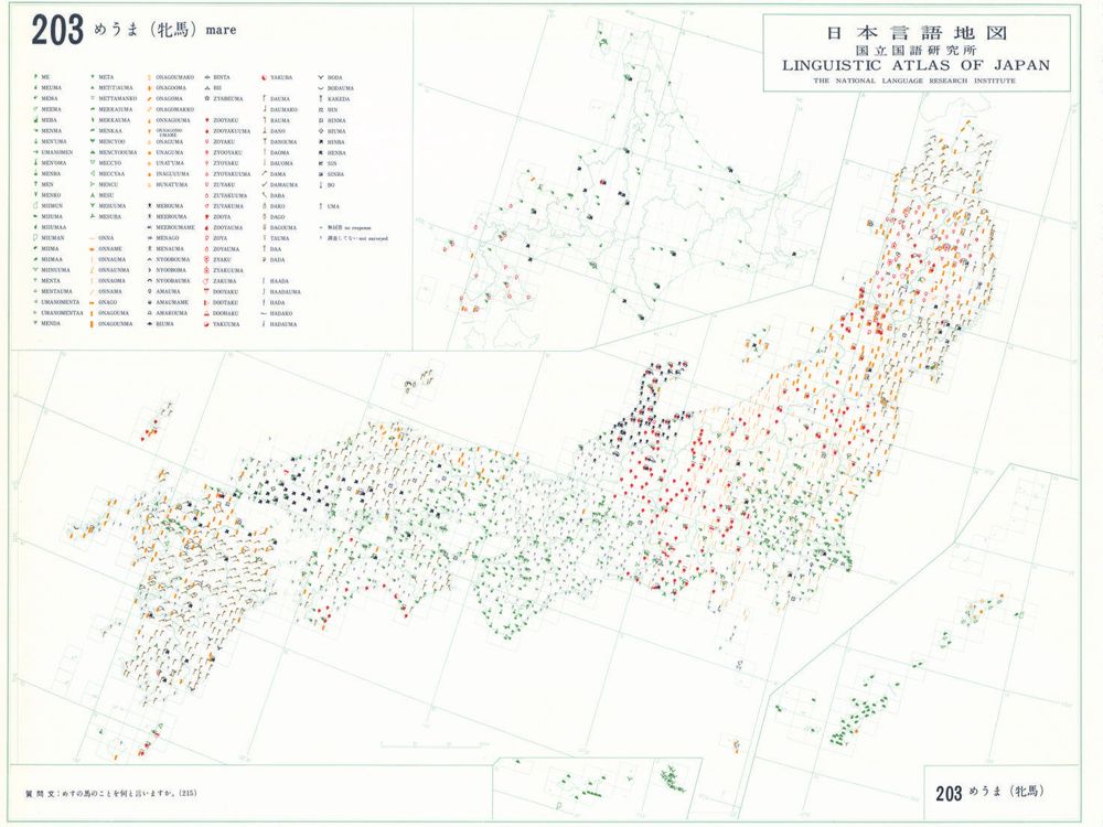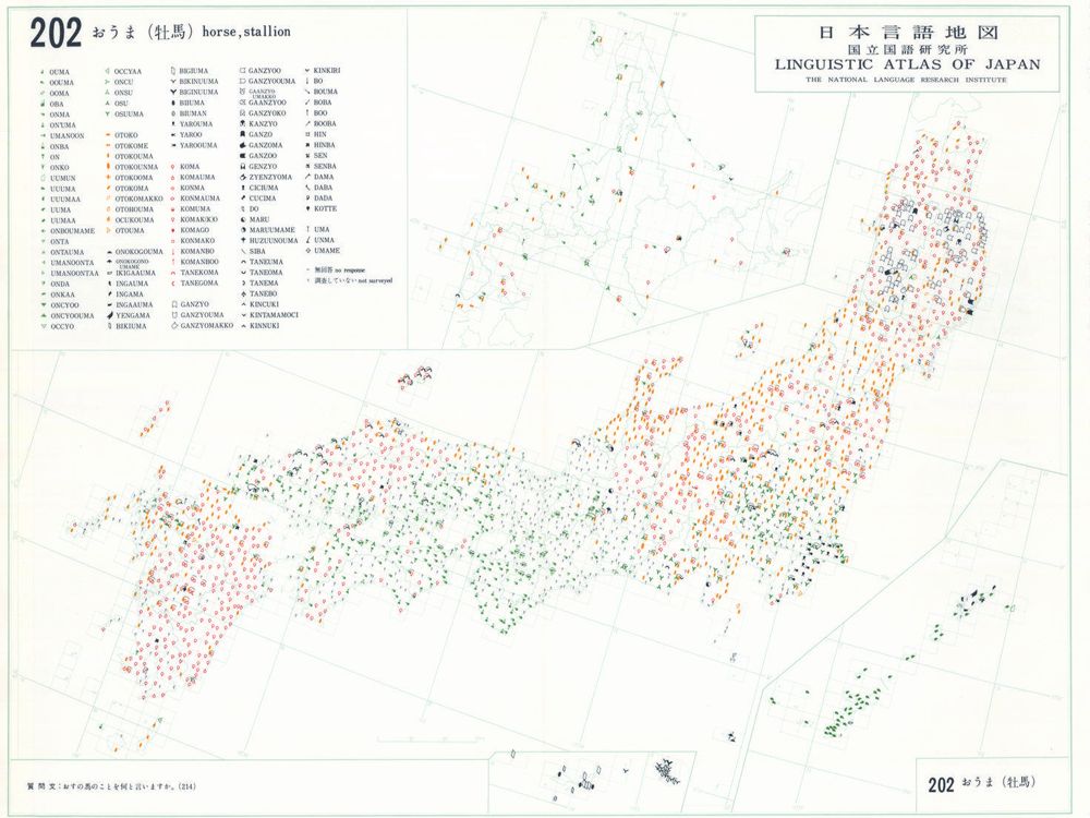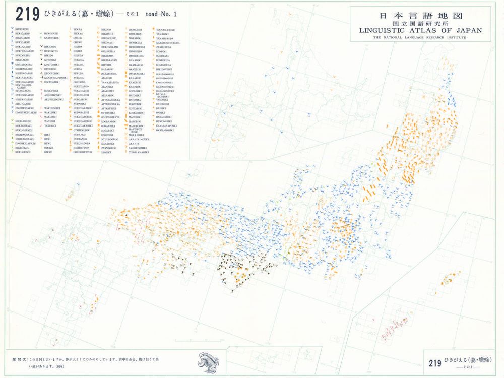 『日本言語地図』は、全国各地の方言で、どのような語形や発音がどこに現れるかを項目ごとに表示した地図で、1966年から1974年にかけて全6巻(言語地図300枚、参考地図6枚、各図解説)が刊行された。『日本言語地図』作成のための現地調査は、1957年から1965年にかけて、全国2,400か所にわたり、国立国語研究所員と同地方調査員によって実施された。言語地理学的手法によって、現代日本標準語の成立過程や、各種方言語形の歴史の解明を目指して作成され、全国の方言の地理的分布を一望できる日本の方言に関する基礎資料である。