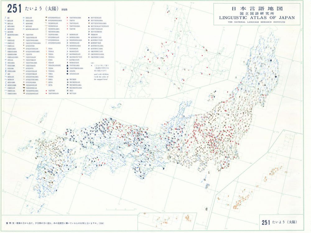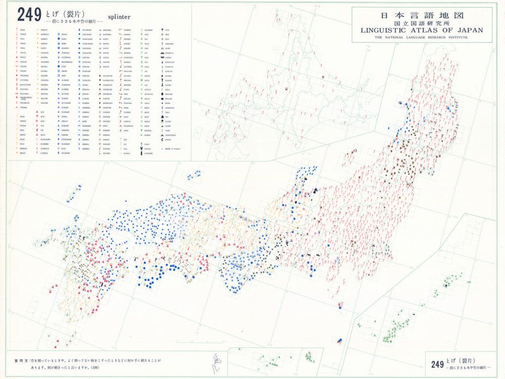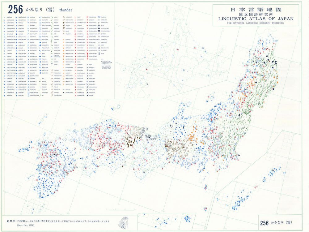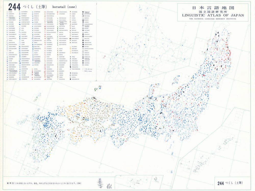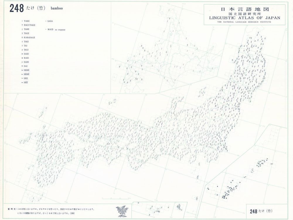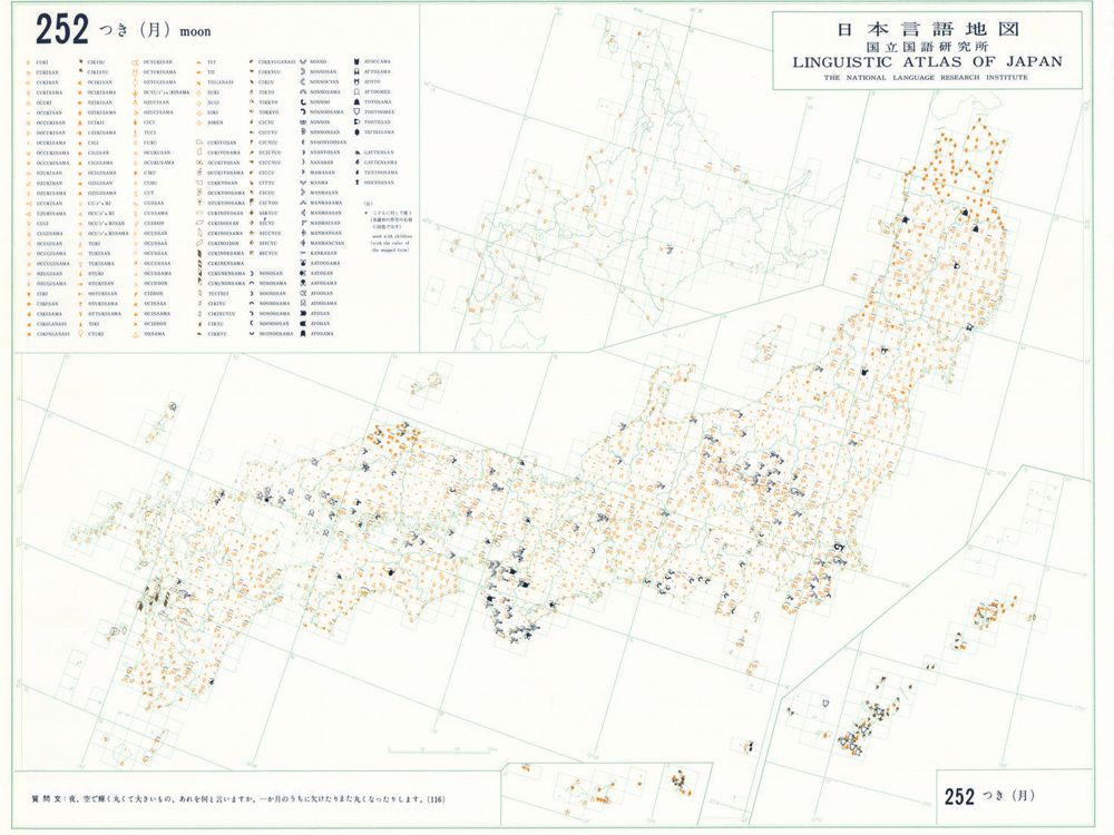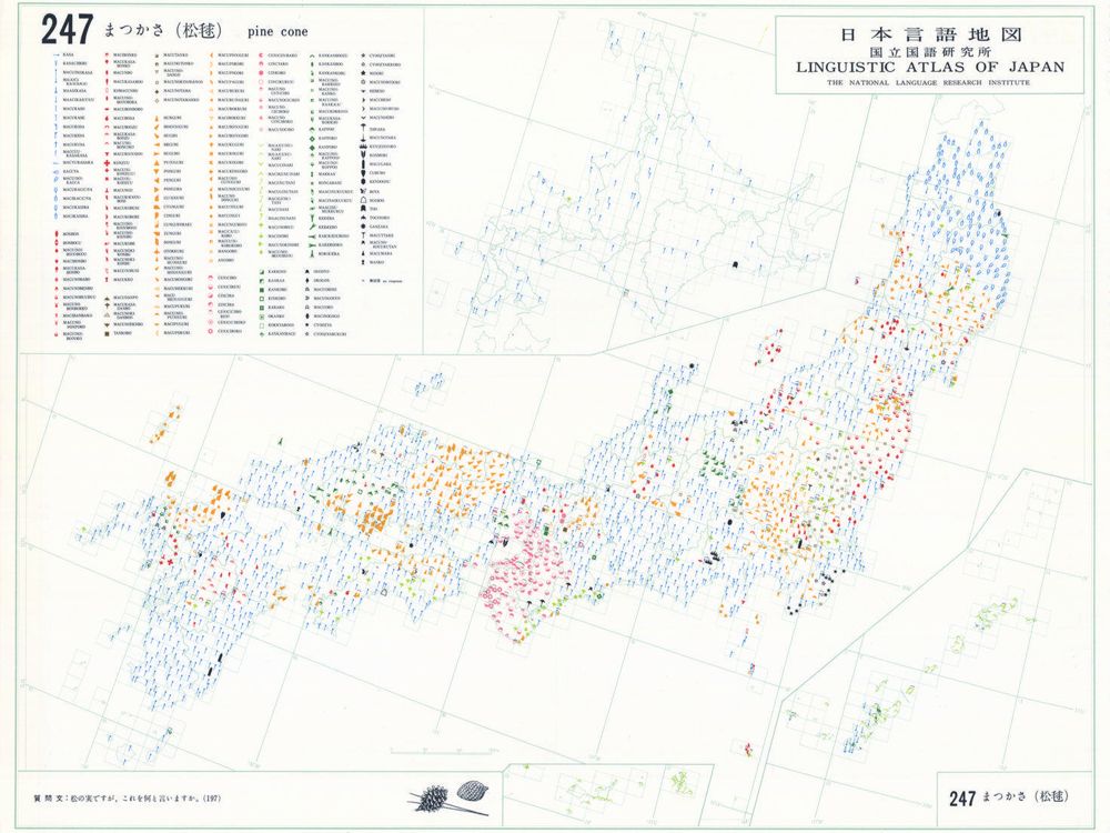 『日本言語地図』は、全国各地の方言で、どのような語形や発音がどこに現れるかを項目ごとに表示した地図で、1966年から1974年にかけて全6巻(言語地図300枚、参考地図6枚、各図解説)が刊行された。『日本言語地図』作成のための現地調査は、1957年から1965年にかけて、全国2,400か所にわたり、国立国語研究所員と同地方調査員によって実施された。言語地理学的手法によって、現代日本標準語の成立過程や、各種方言語形の歴史の解明を目指して作成され、全国の方言の地理的分布を一望できる日本の方言に関する基礎資料である。