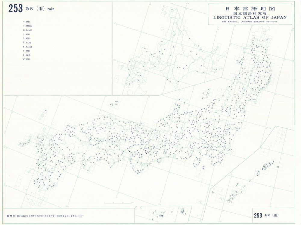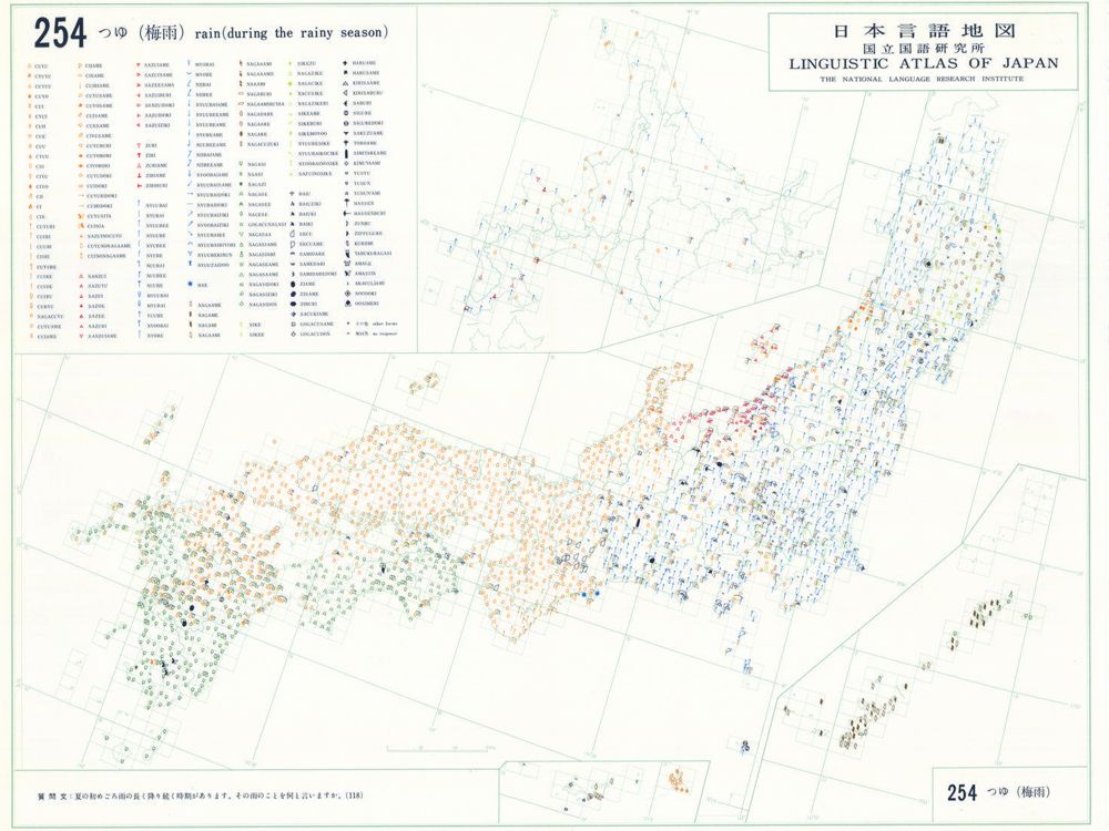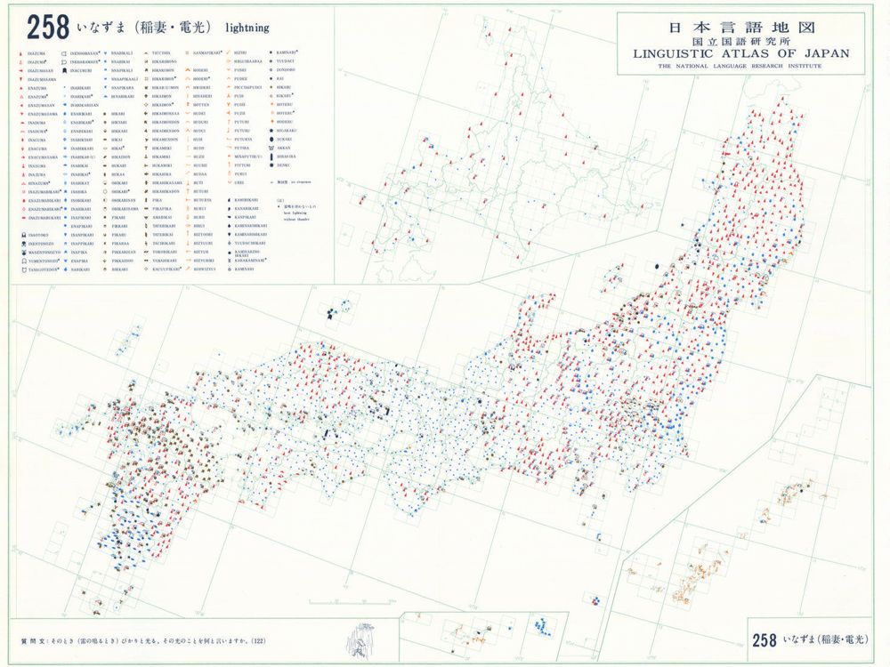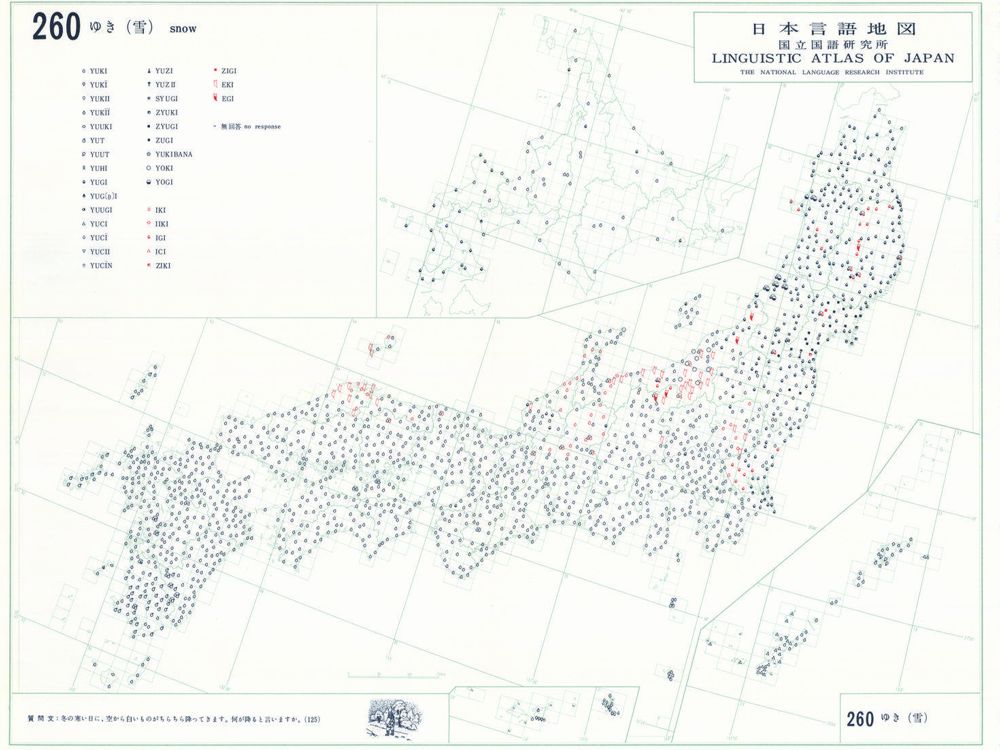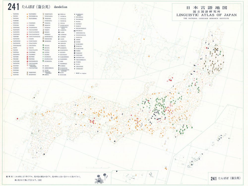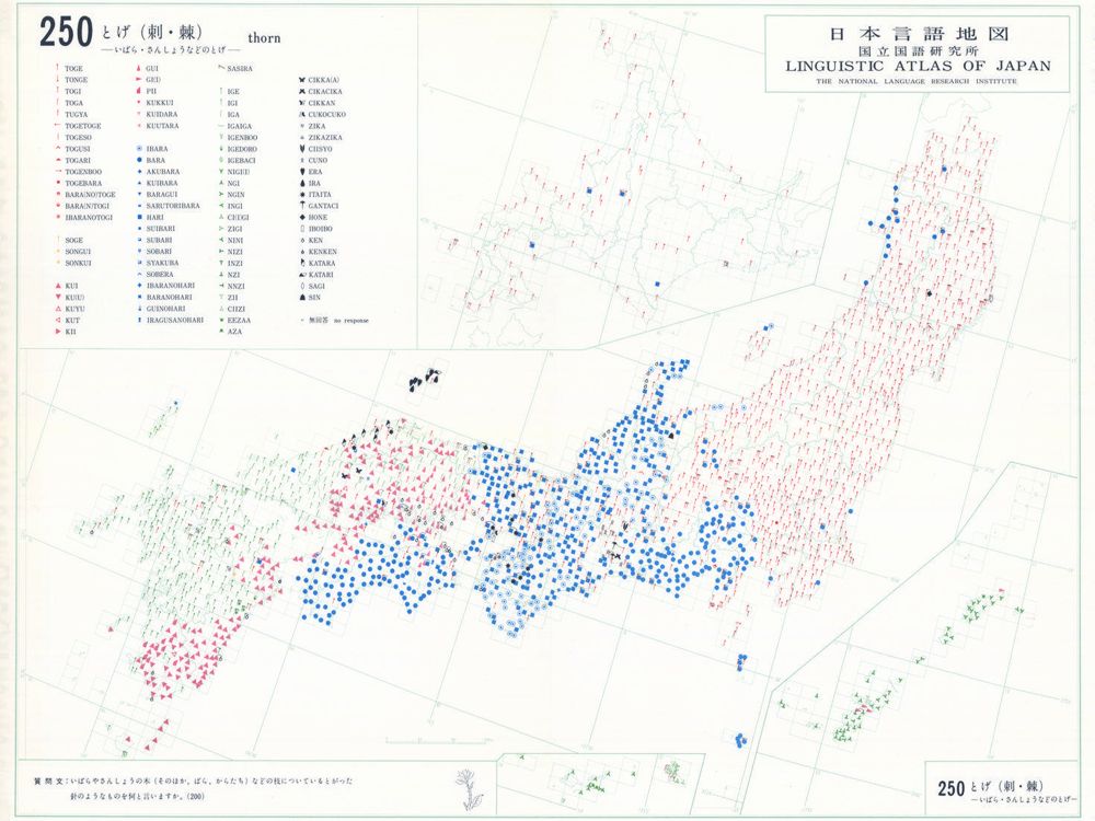 『日本言語地図』は、全国各地の方言で、どのような語形や発音がどこに現れるかを項目ごとに表示した地図で、1966年から1974年にかけて全6巻(言語地図300枚、参考地図6枚、各図解説)が刊行された。『日本言語地図』作成のための現地調査は、1957年から1965年にかけて、全国2,400か所にわたり、国立国語研究所員と同地方調査員によって実施された。言語地理学的手法によって、現代日本標準語の成立過程や、各種方言語形の歴史の解明を目指して作成され、全国の方言の地理的分布を一望できる日本の方言に関する基礎資料である。