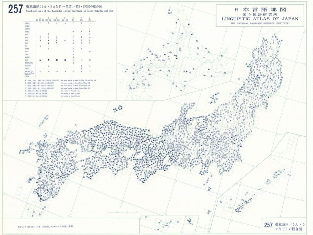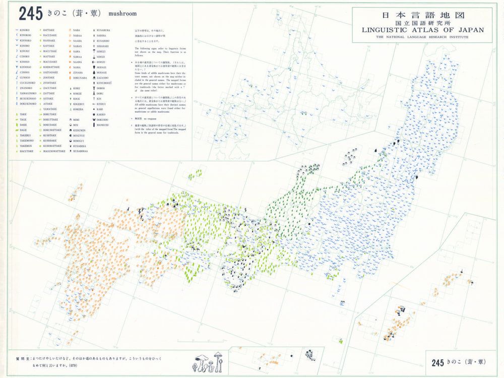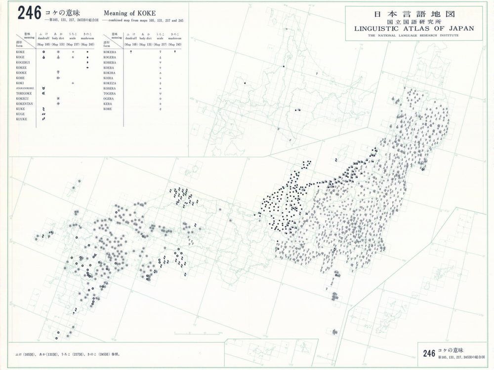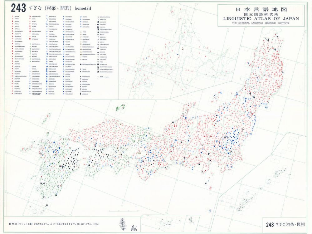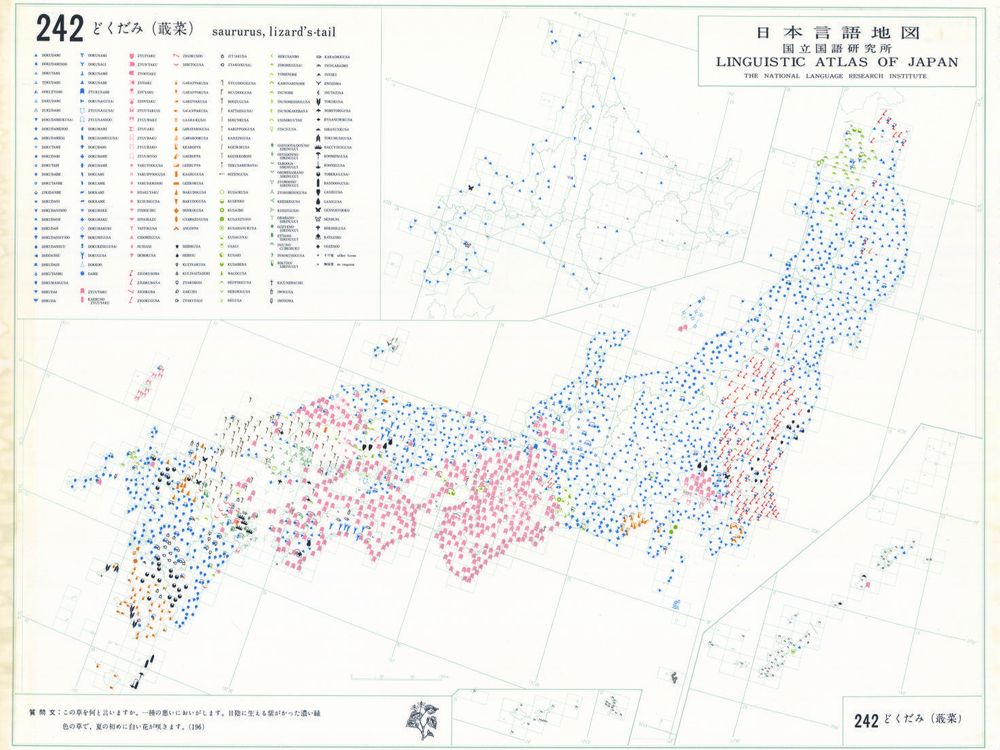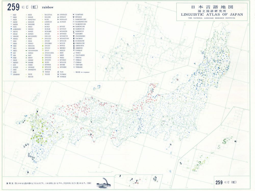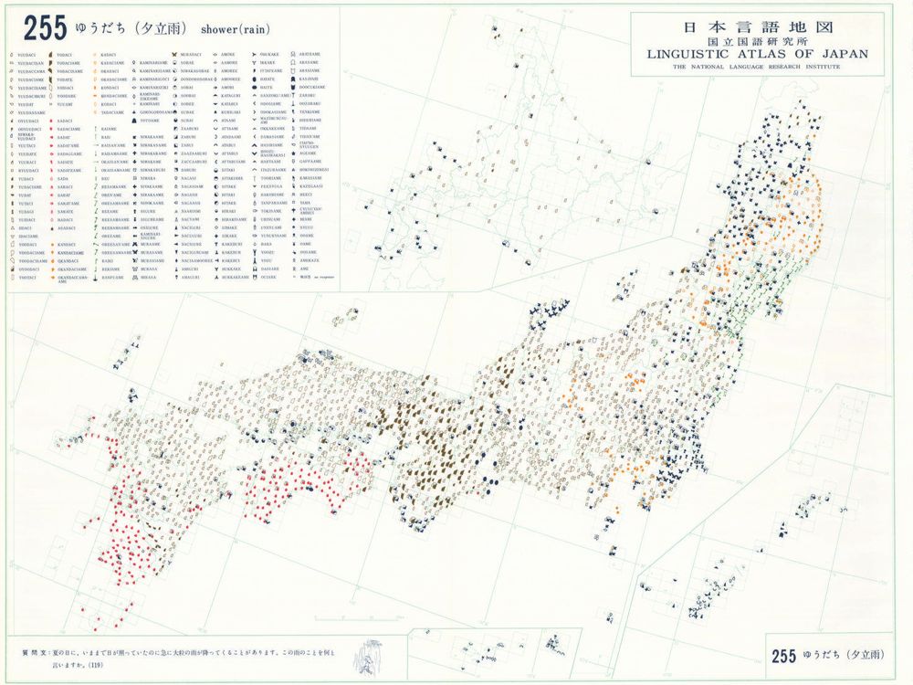 『日本言語地図』は、全国各地の方言で、どのような語形や発音がどこに現れるかを項目ごとに表示した地図で、1966年から1974年にかけて全6巻(言語地図300枚、参考地図6枚、各図解説)が刊行された。『日本言語地図』作成のための現地調査は、1957年から1965年にかけて、全国2,400か所にわたり、国立国語研究所員と同地方調査員によって実施された。言語地理学的手法によって、現代日本標準語の成立過程や、各種方言語形の歴史の解明を目指して作成され、全国の方言の地理的分布を一望できる日本の方言に関する基礎資料である。