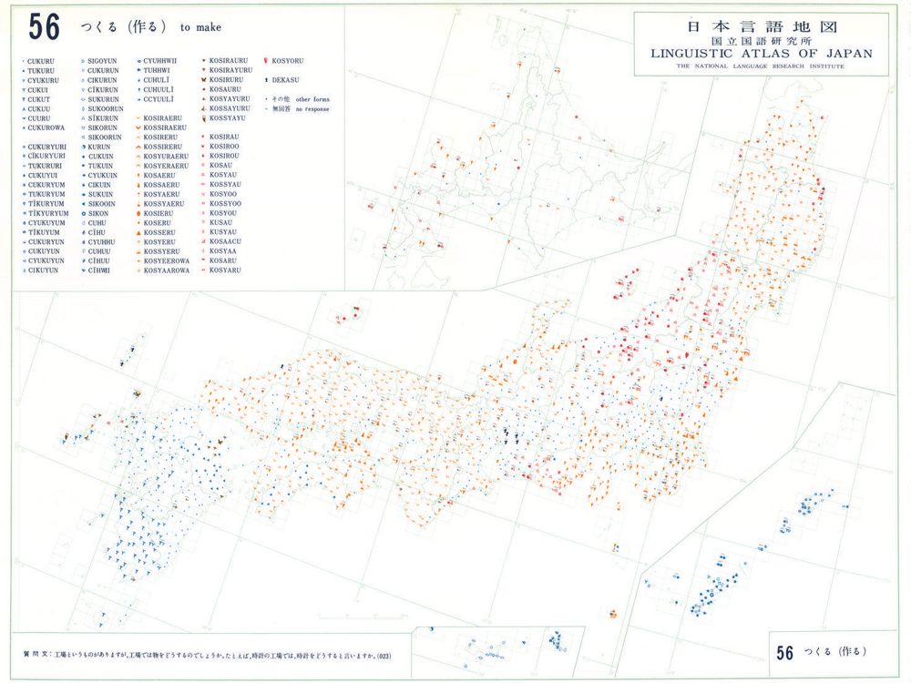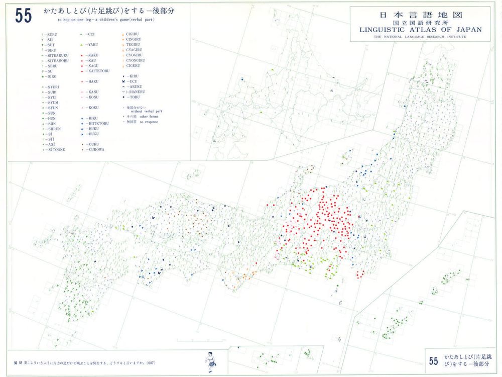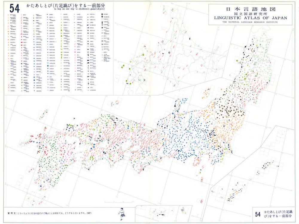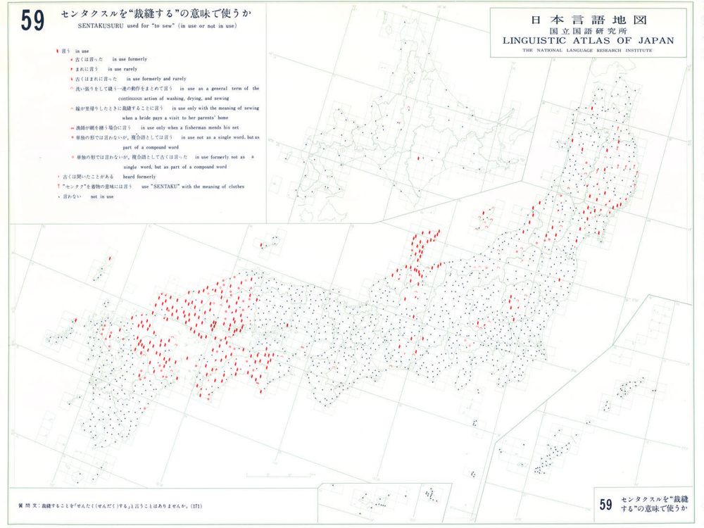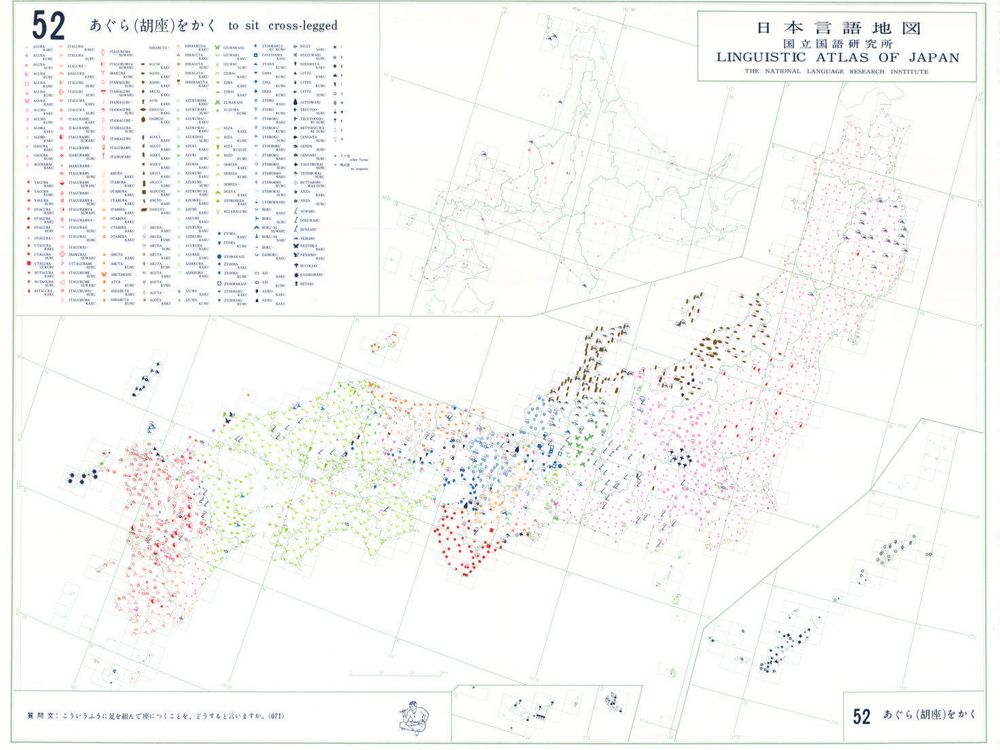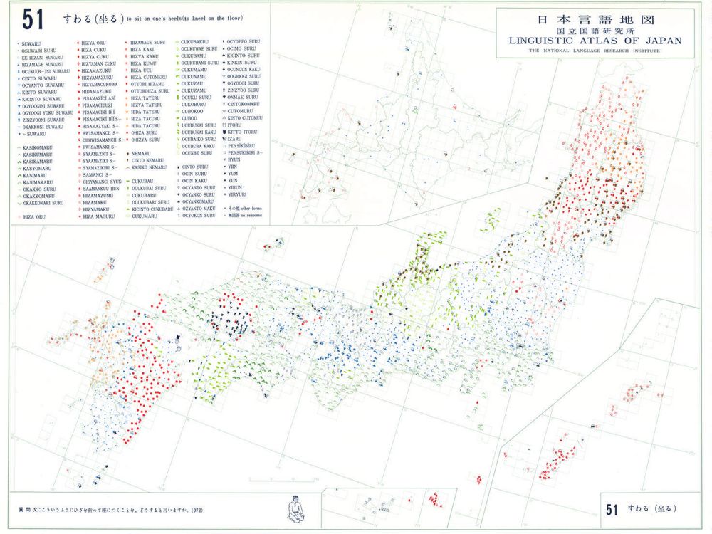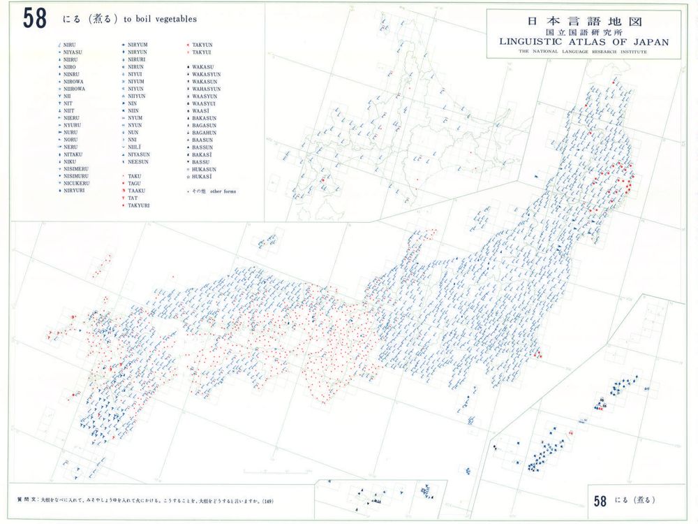 『日本言語地図』は、全国各地の方言で、どのような語形や発音がどこに現れるかを項目ごとに表示した地図で、1966年から1974年にかけて全6巻(言語地図300枚、参考地図6枚、各図解説)が刊行された。『日本言語地図』作成のための現地調査は、1957年から1965年にかけて、全国2,400か所にわたり、国立国語研究所員と同地方調査員によって実施された。言語地理学的手法によって、現代日本標準語の成立過程や、各種方言語形の歴史の解明を目指して作成され、全国の方言の地理的分布を一望できる日本の方言に関する基礎資料である。