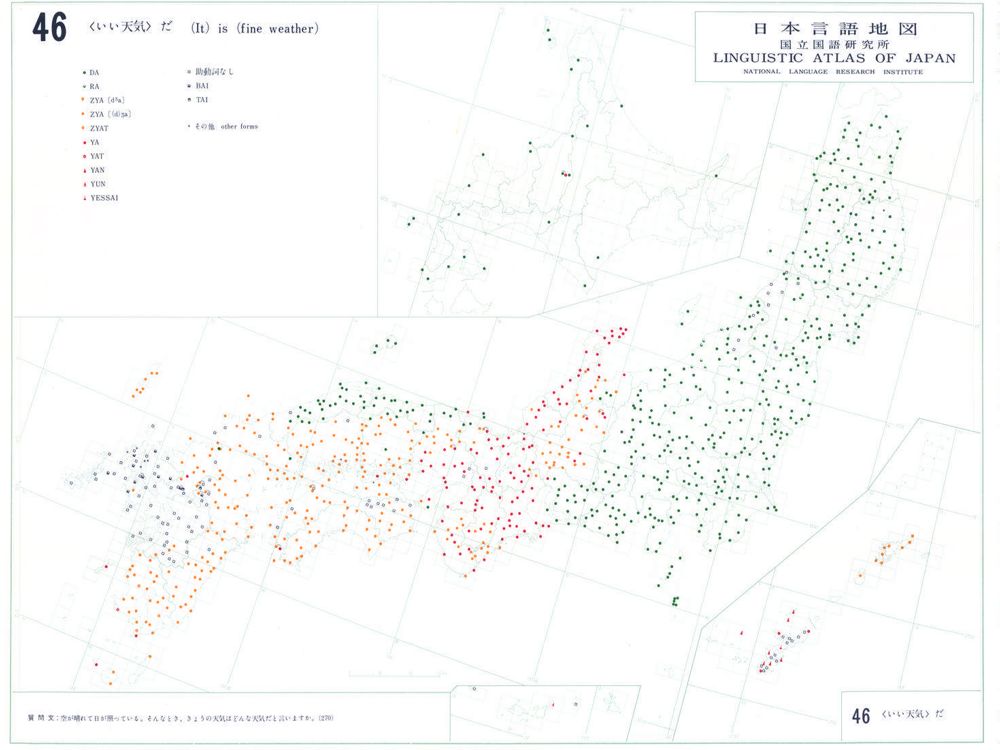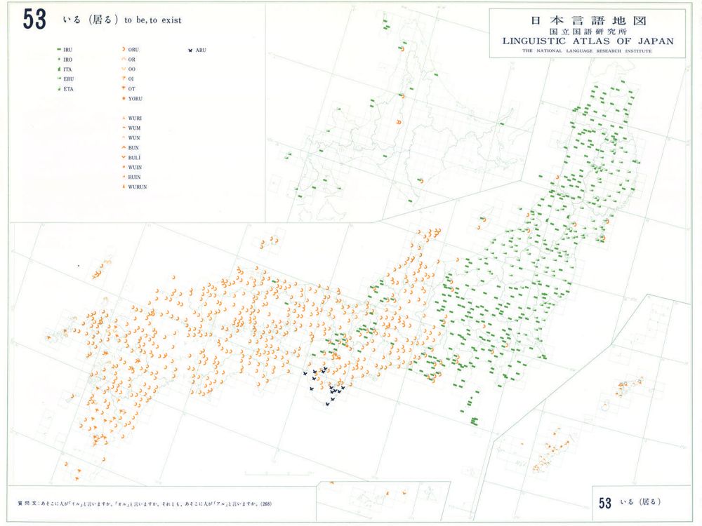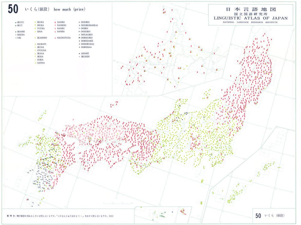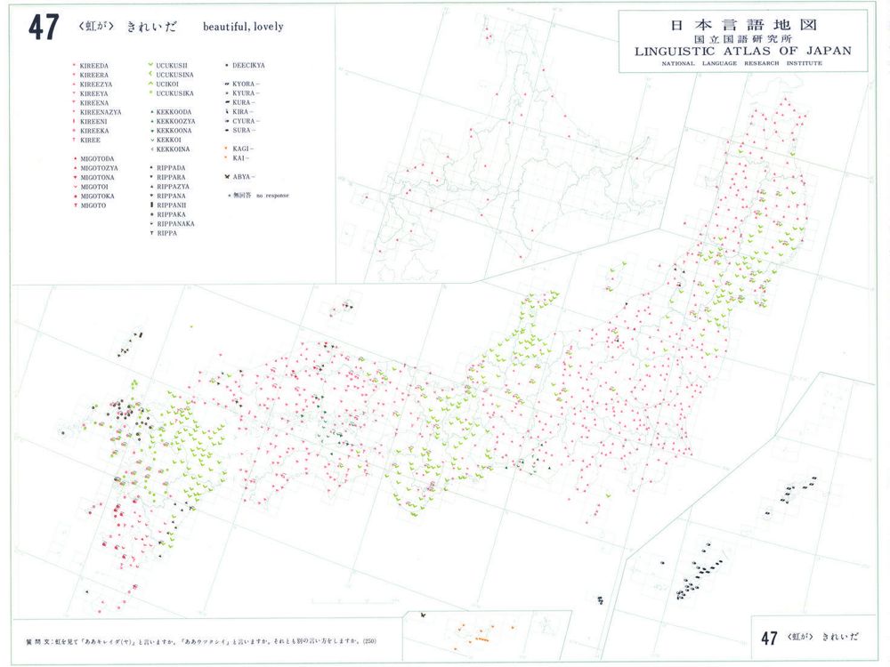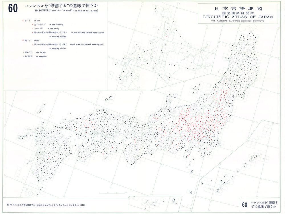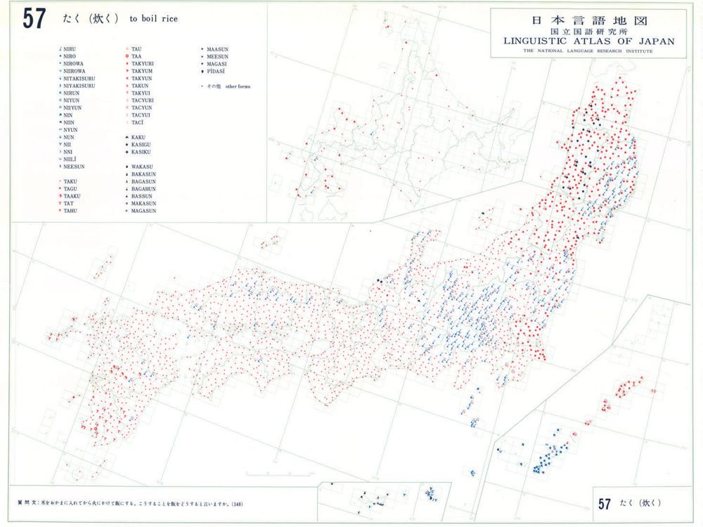 『日本言語地図』は、全国各地の方言で、どのような語形や発音がどこに現れるかを項目ごとに表示した地図で、1966年から1974年にかけて全6巻(言語地図300枚、参考地図6枚、各図解説)が刊行された。『日本言語地図』作成のための現地調査は、1957年から1965年にかけて、全国2,400か所にわたり、国立国語研究所員と同地方調査員によって実施された。言語地理学的手法によって、現代日本標準語の成立過程や、各種方言語形の歴史の解明を目指して作成され、全国の方言の地理的分布を一望できる日本の方言に関する基礎資料である。