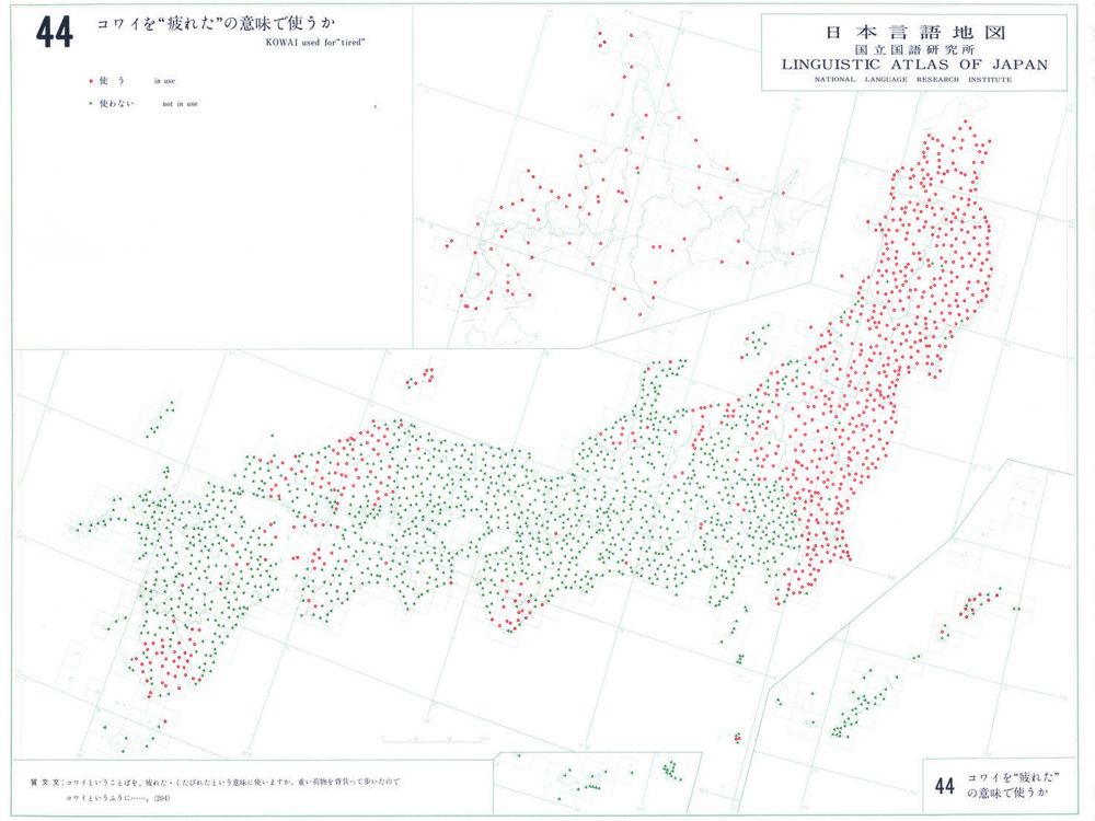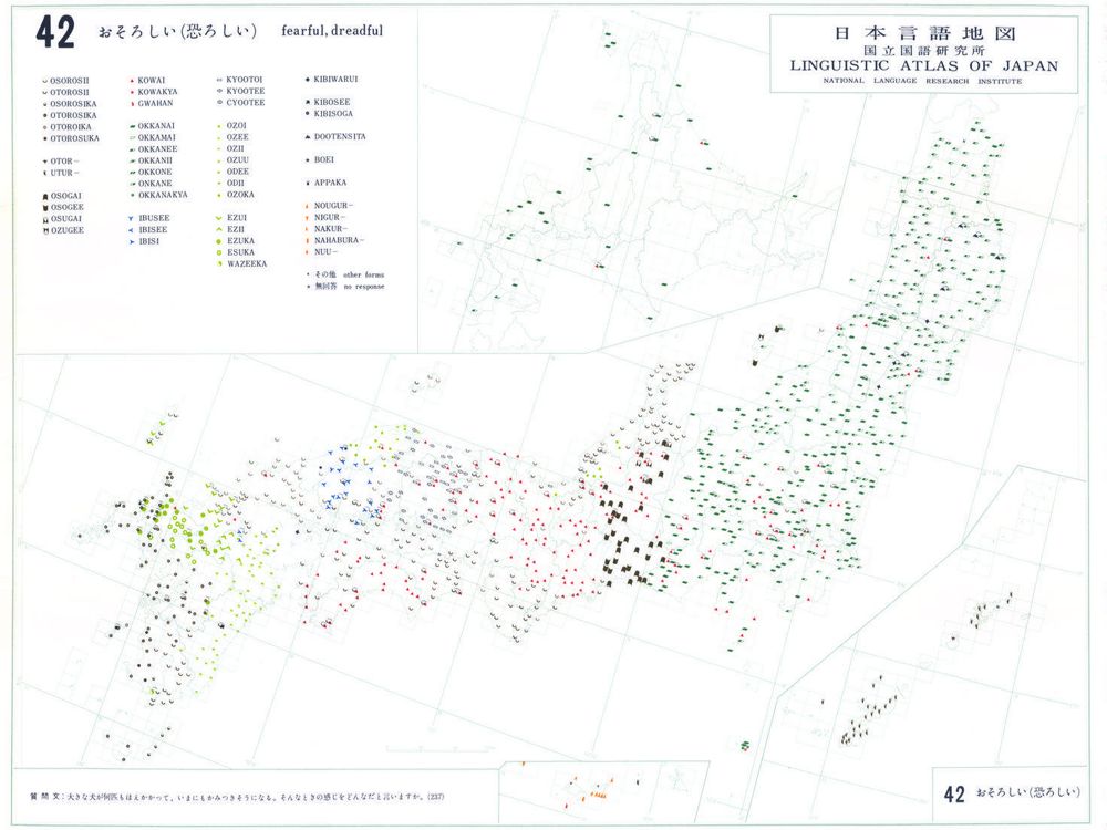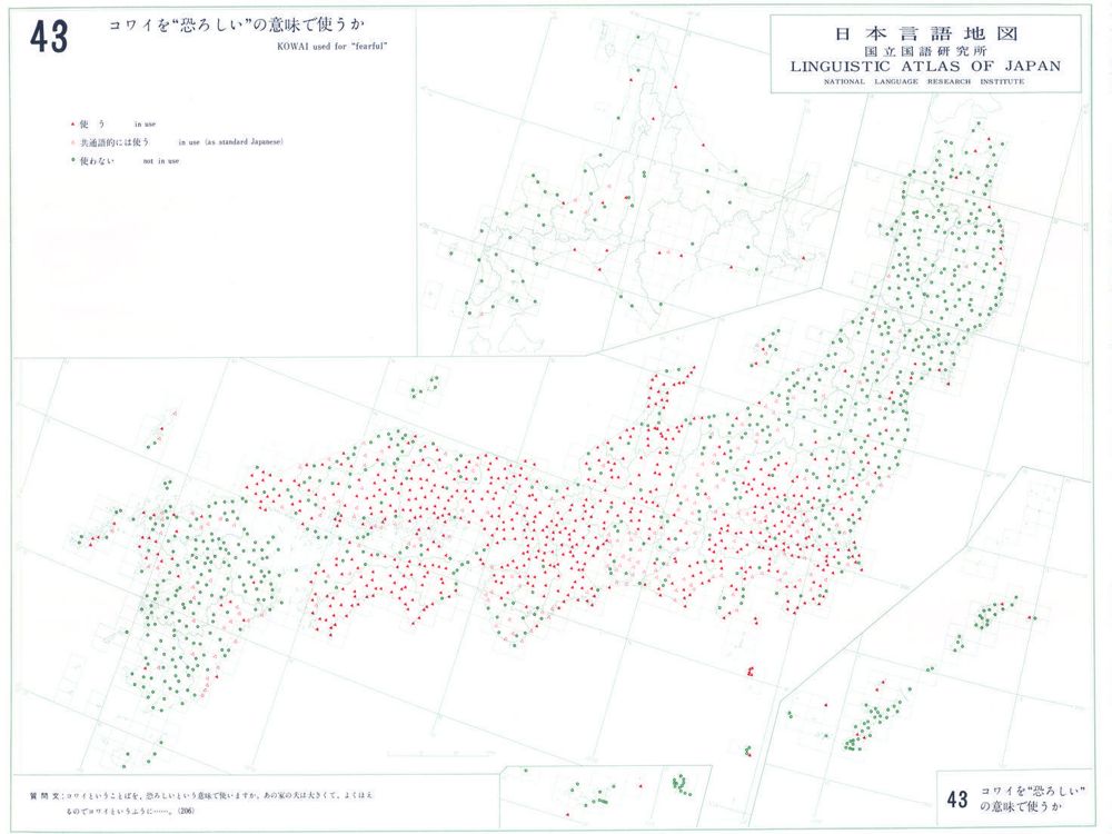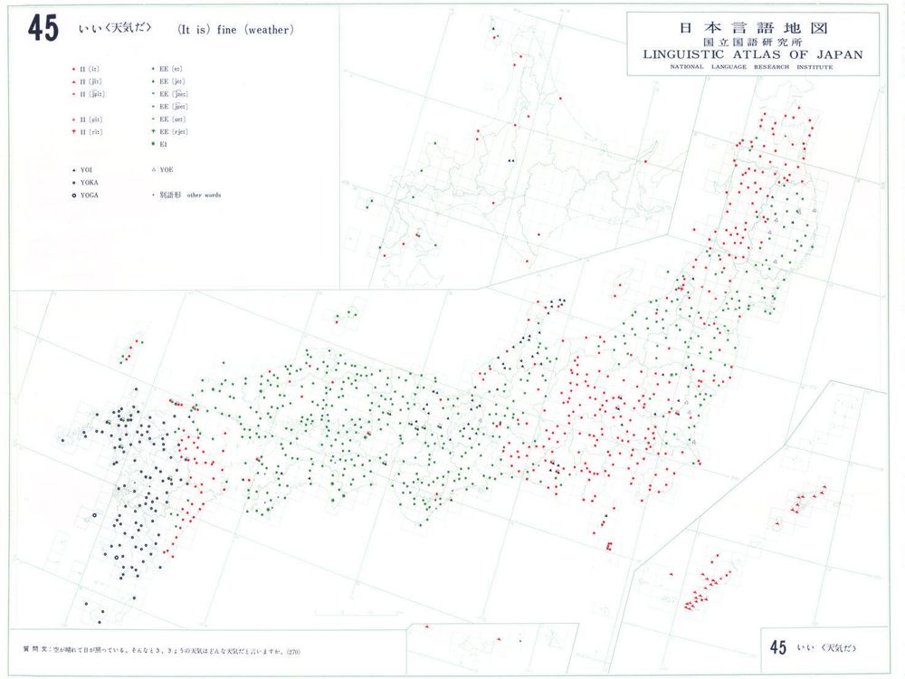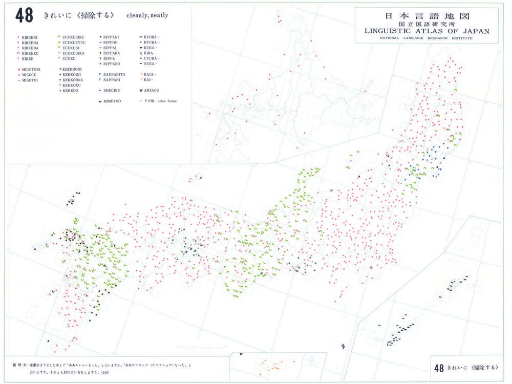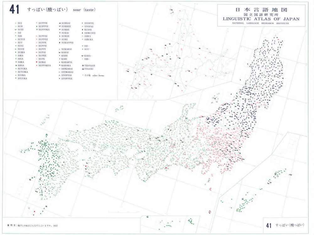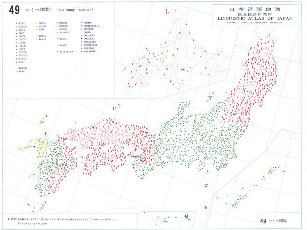 『日本言語地図』は、全国各地の方言で、どのような語形や発音がどこに現れるかを項目ごとに表示した地図で、1966年から1974年にかけて全6巻(言語地図300枚、参考地図6枚、各図解説)が刊行された。『日本言語地図』作成のための現地調査は、1957年から1965年にかけて、全国2,400か所にわたり、国立国語研究所員と同地方調査員によって実施された。言語地理学的手法によって、現代日本標準語の成立過程や、各種方言語形の歴史の解明を目指して作成され、全国の方言の地理的分布を一望できる日本の方言に関する基礎資料である。