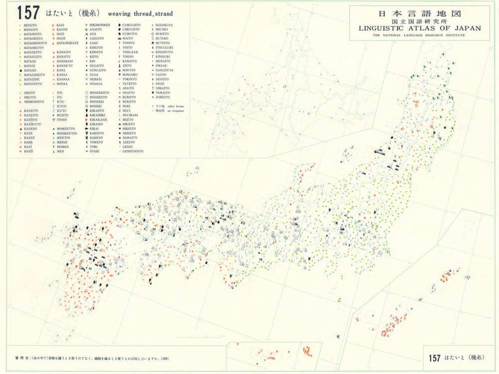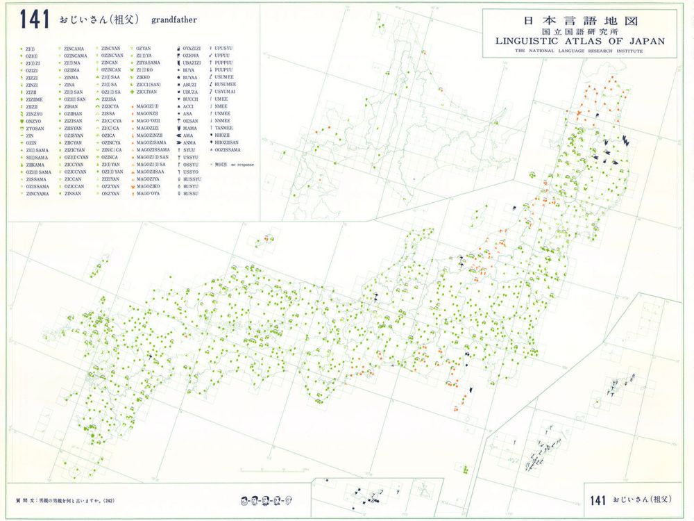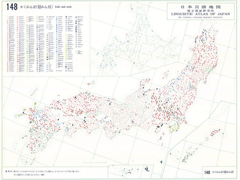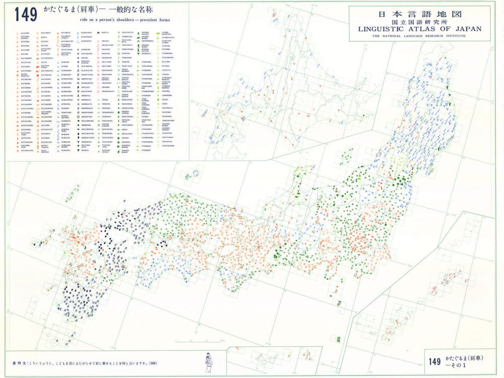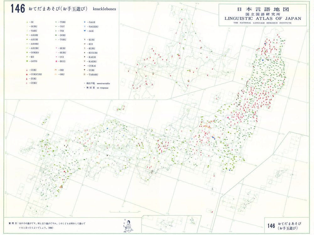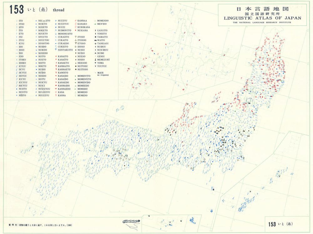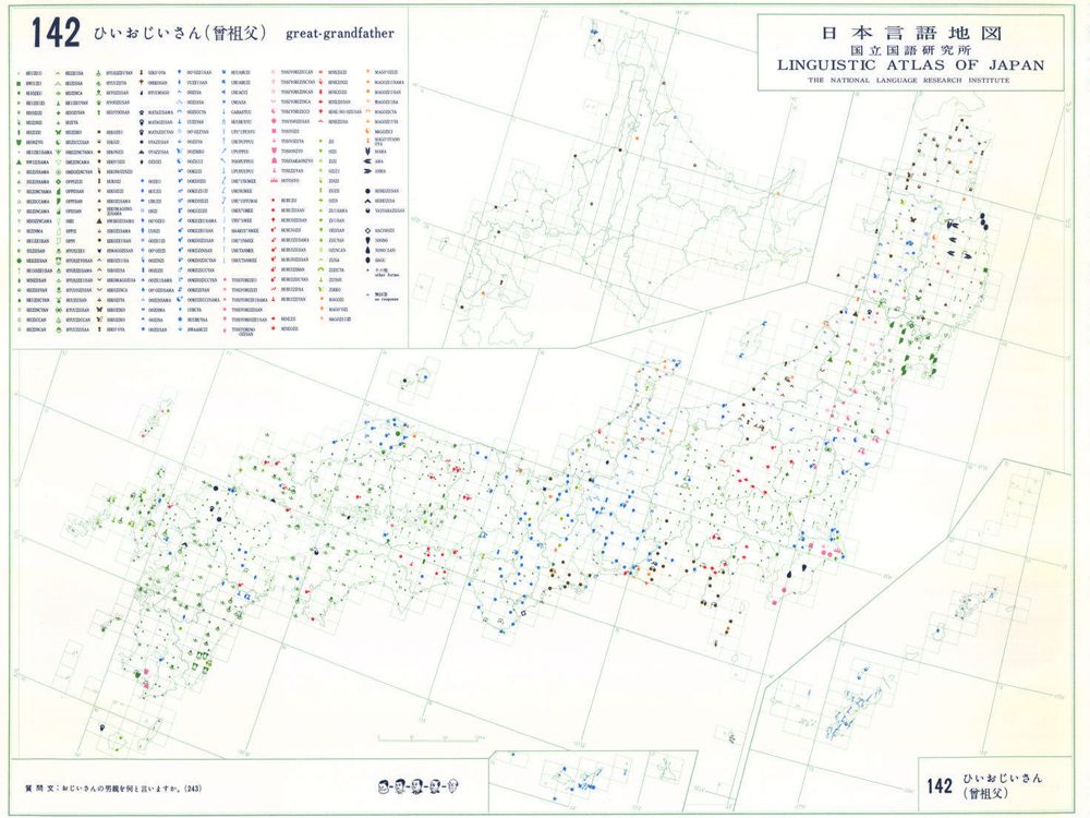 『日本言語地図』は、全国各地の方言で、どのような語形や発音がどこに現れるかを項目ごとに表示した地図で、1966年から1974年にかけて全6巻(言語地図300枚、参考地図6枚、各図解説)が刊行された。『日本言語地図』作成のための現地調査は、1957年から1965年にかけて、全国2,400か所にわたり、国立国語研究所員と同地方調査員によって実施された。言語地理学的手法によって、現代日本標準語の成立過程や、各種方言語形の歴史の解明を目指して作成され、全国の方言の地理的分布を一望できる日本の方言に関する基礎資料である。