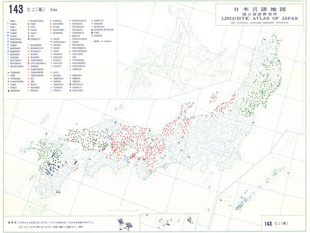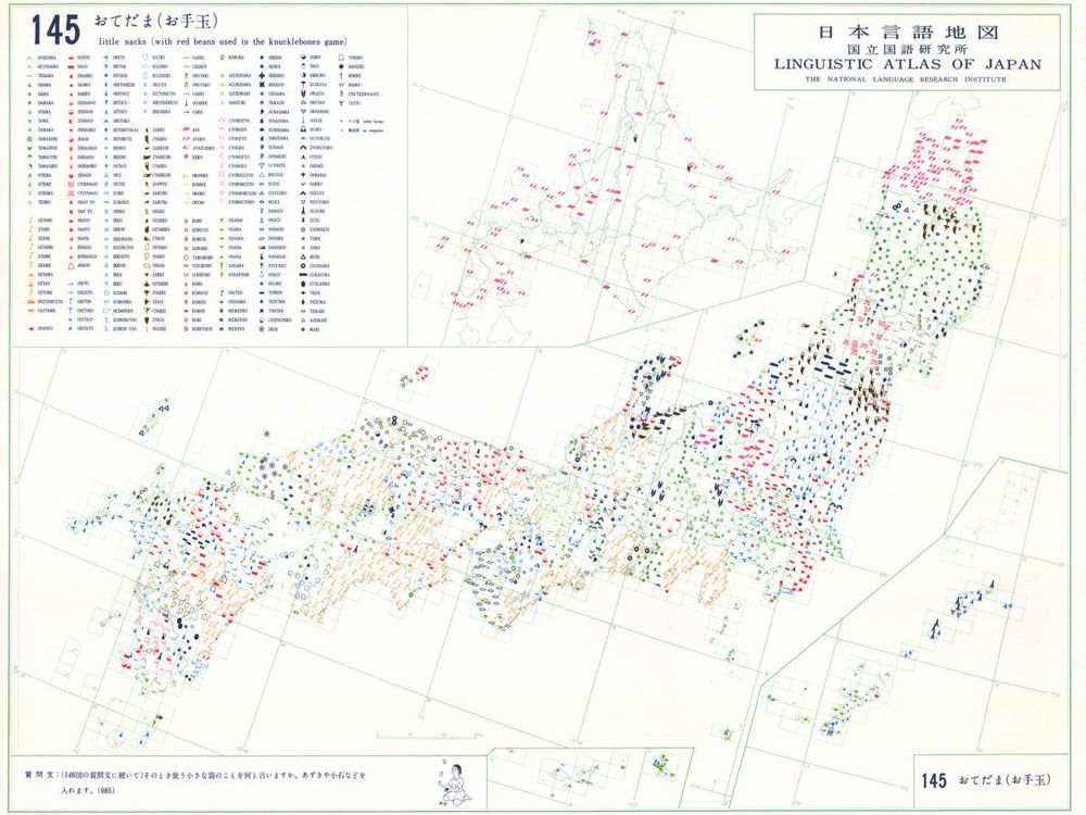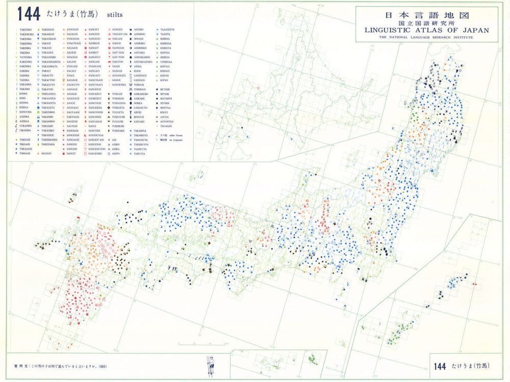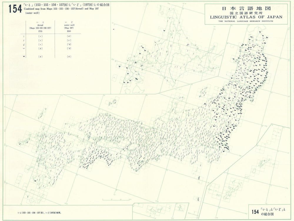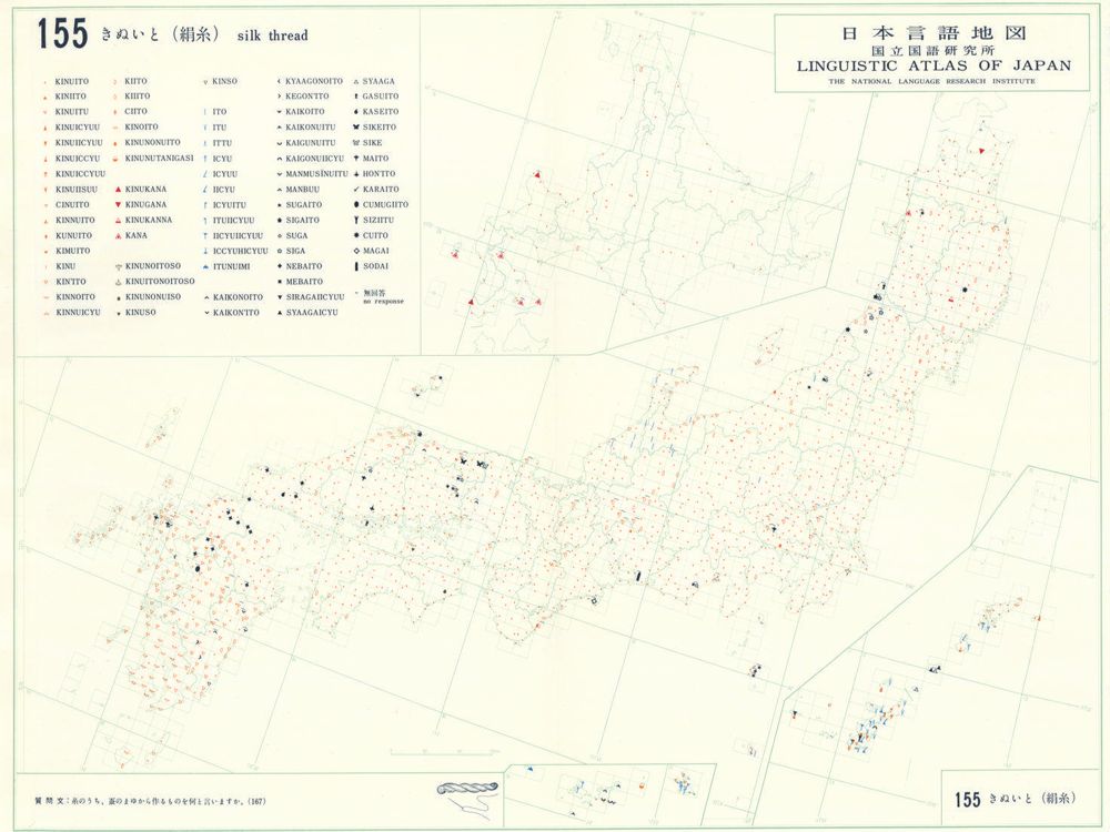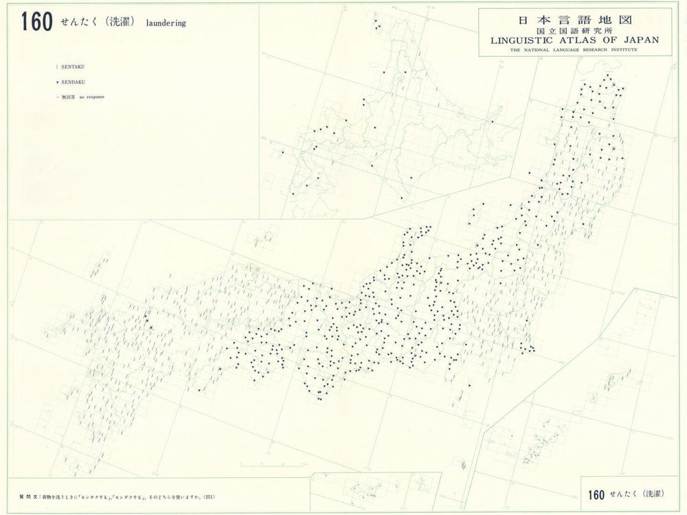 『日本言語地図』は、全国各地の方言で、どのような語形や発音がどこに現れるかを項目ごとに表示した地図で、1966年から1974年にかけて全6巻(言語地図300枚、参考地図6枚、各図解説)が刊行された。『日本言語地図』作成のための現地調査は、1957年から1965年にかけて、全国2,400か所にわたり、国立国語研究所員と同地方調査員によって実施された。言語地理学的手法によって、現代日本標準語の成立過程や、各種方言語形の歴史の解明を目指して作成され、全国の方言の地理的分布を一望できる日本の方言に関する基礎資料である。
