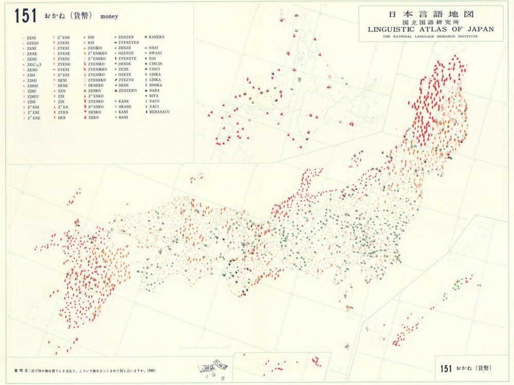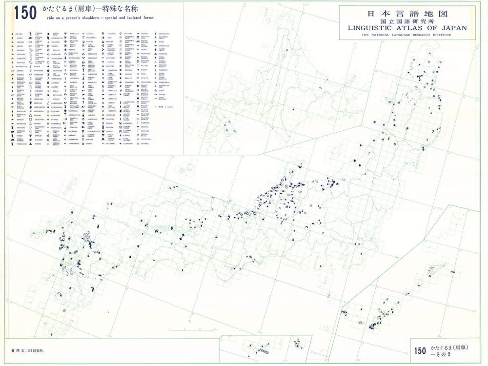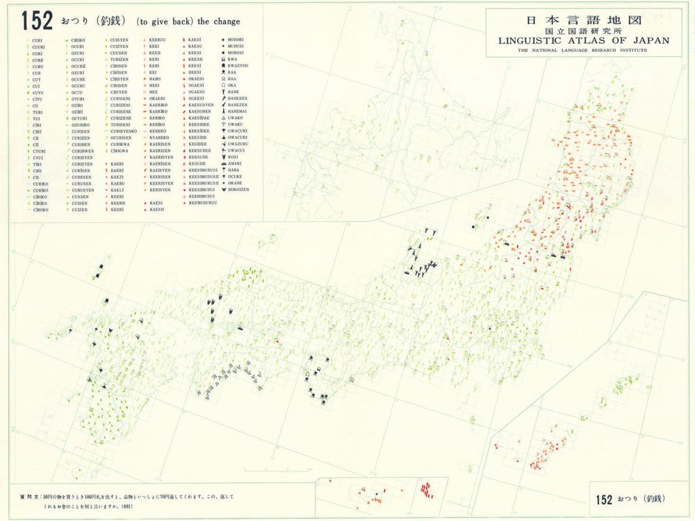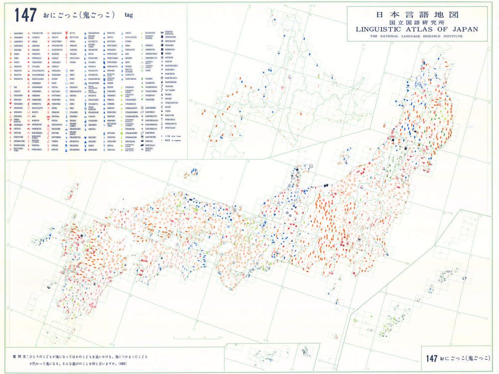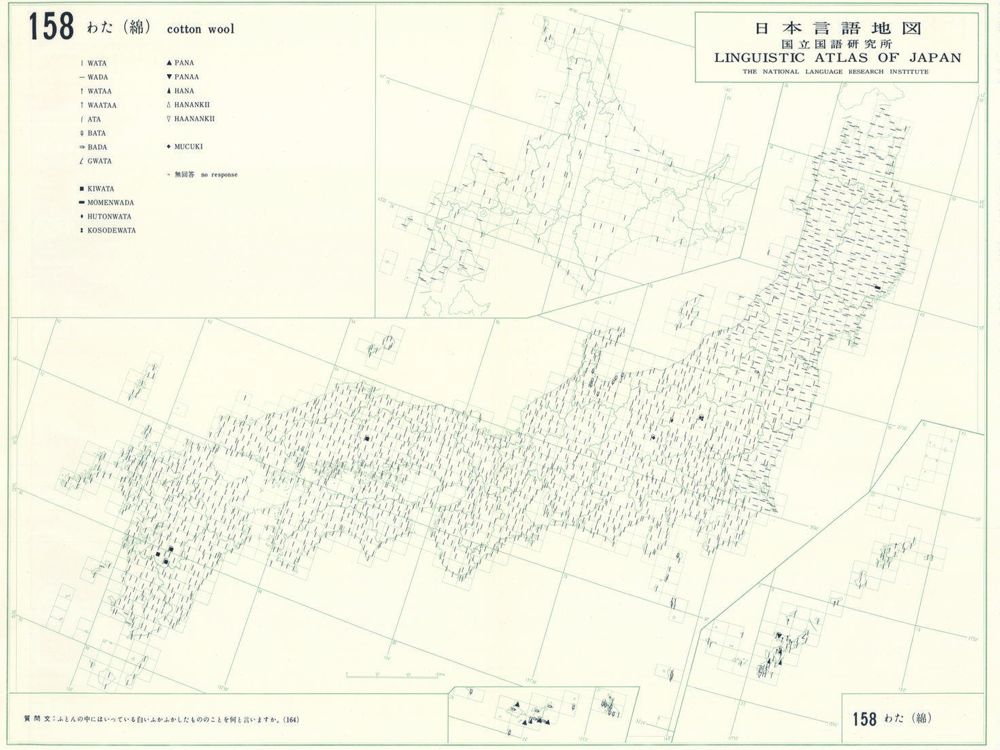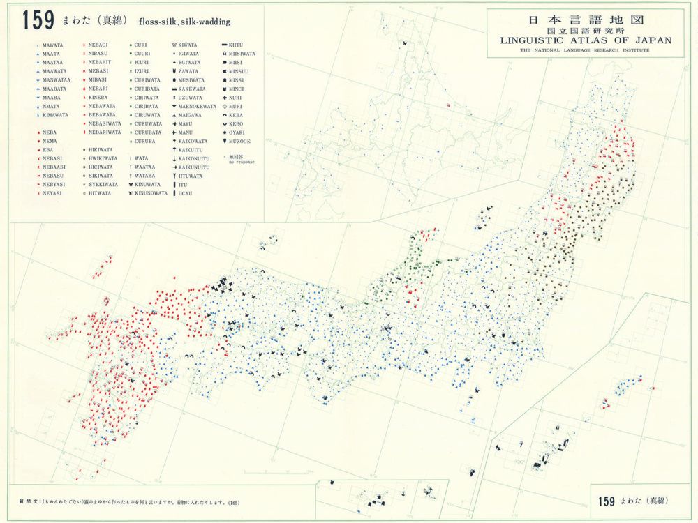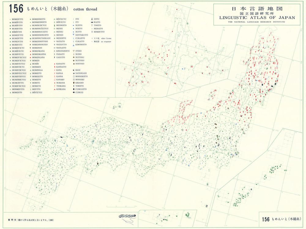 『日本言語地図』は、全国各地の方言で、どのような語形や発音がどこに現れるかを項目ごとに表示した地図で、1966年から1974年にかけて全6巻(言語地図300枚、参考地図6枚、各図解説)が刊行された。『日本言語地図』作成のための現地調査は、1957年から1965年にかけて、全国2,400か所にわたり、国立国語研究所員と同地方調査員によって実施された。言語地理学的手法によって、現代日本標準語の成立過程や、各種方言語形の歴史の解明を目指して作成され、全国の方言の地理的分布を一望できる日本の方言に関する基礎資料である。