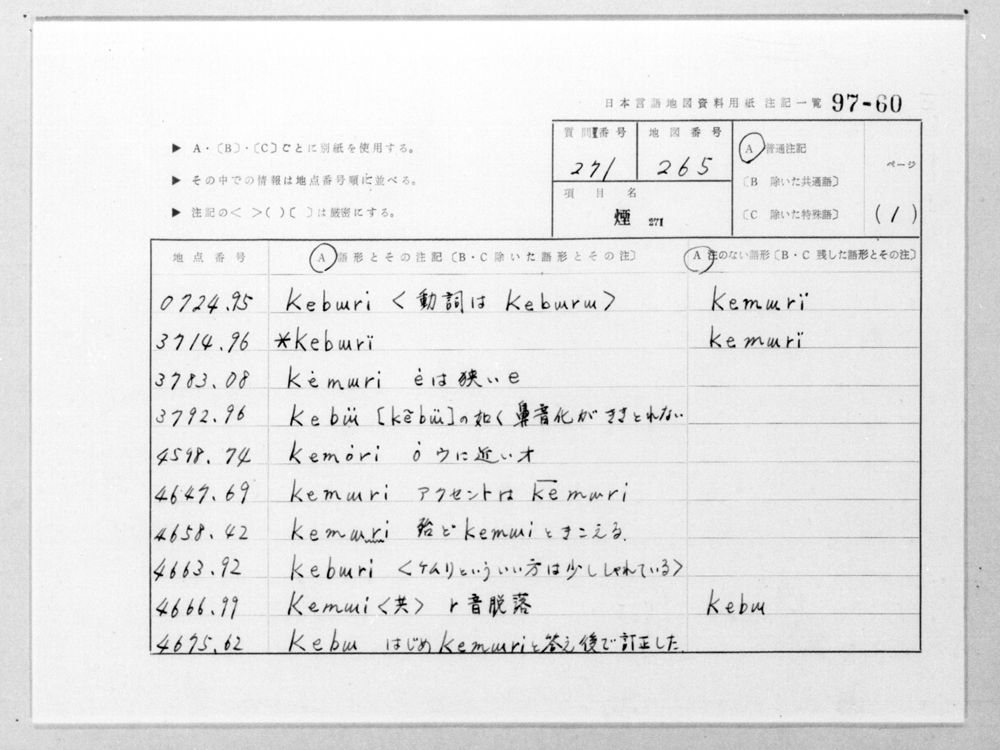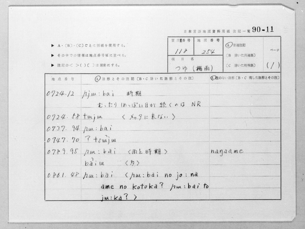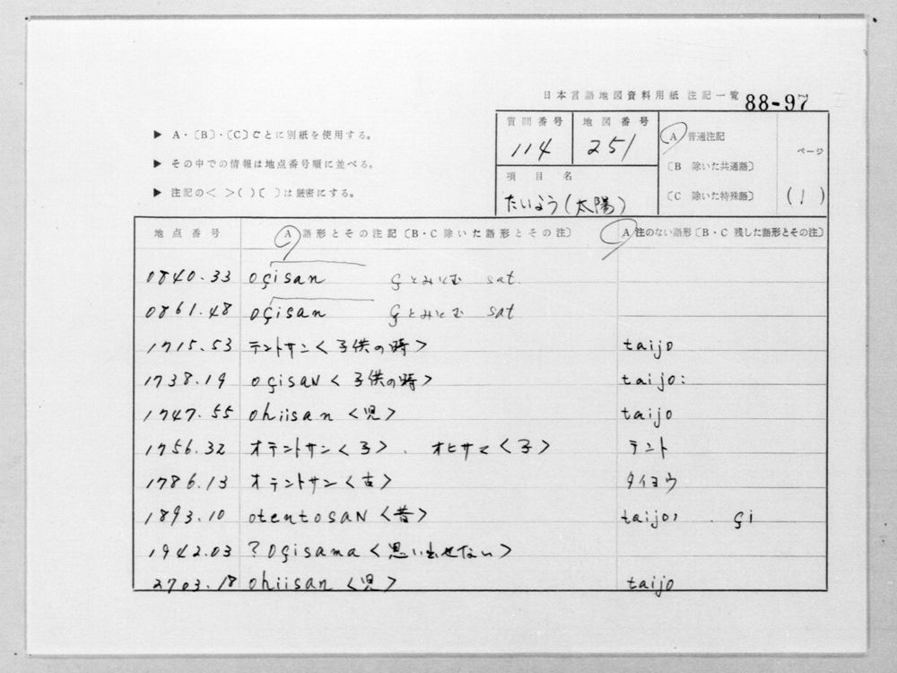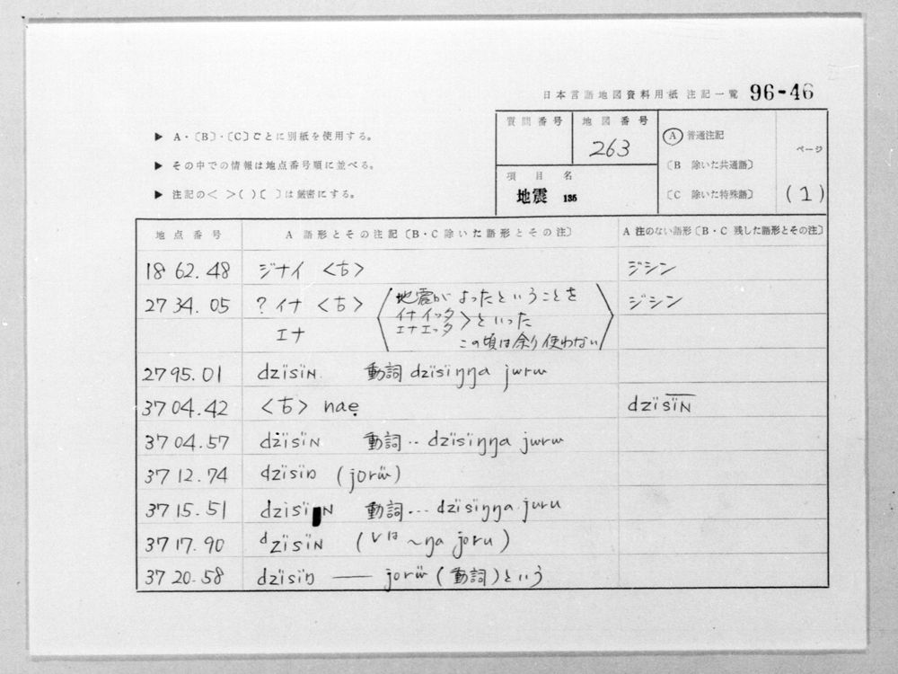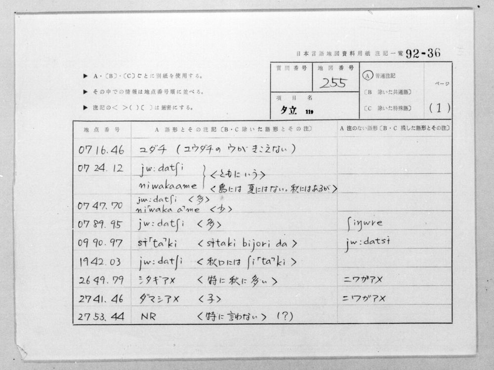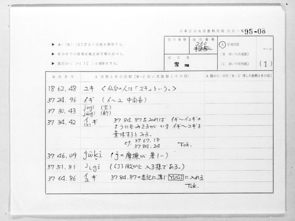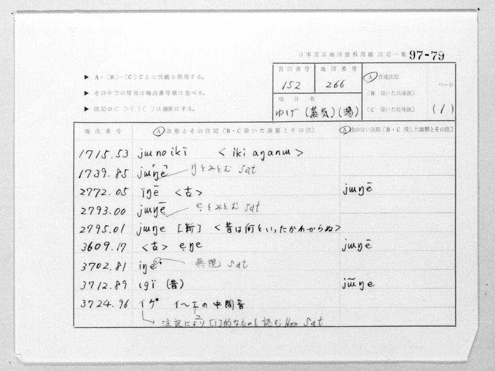 注記一覧は『日本言語地図』全6巻(1966〜1974年刊行)の編集作業と平行して作成された。その後、独立行政法人国立国語研究所において各種報告書・研究資料の電子化事業が実施され(2001〜2005年)、その一環として注記一覧のデジタル撮影が行われ、PDFが公開された。当時のデジタル撮影画像を利用して、今般IIIF化を実現するに至った。なお、注記一覧の原紙は製本され、国立国語研究所研究図書室の蔵書として閲覧利用に供されている。