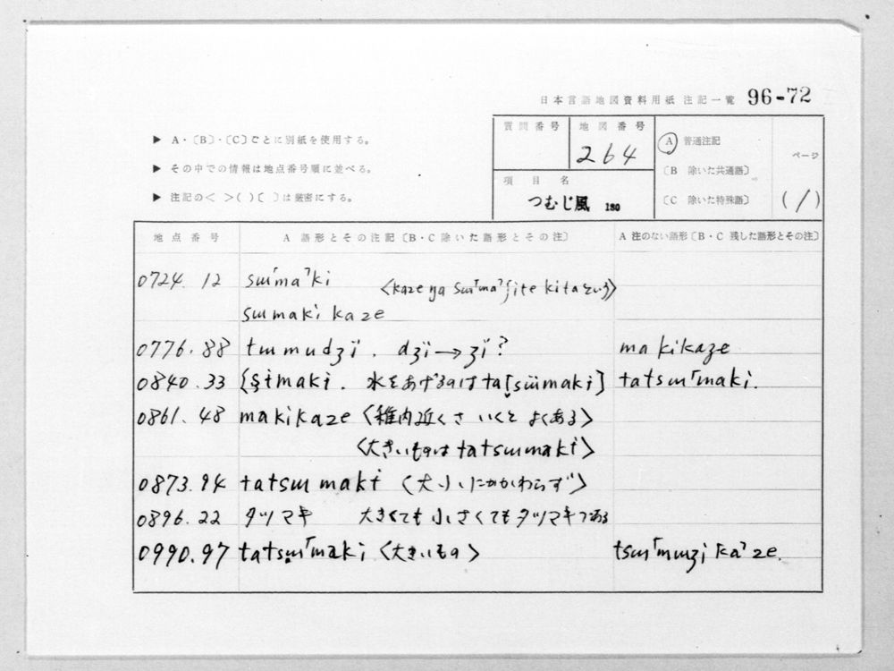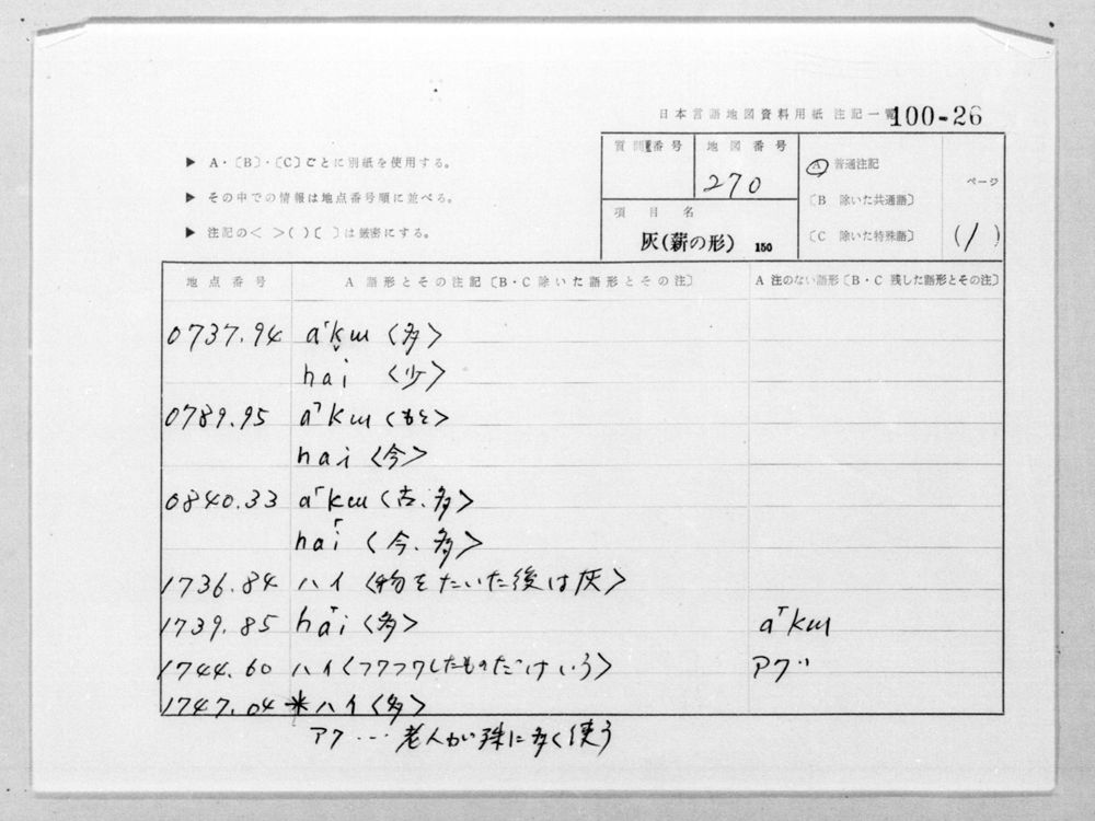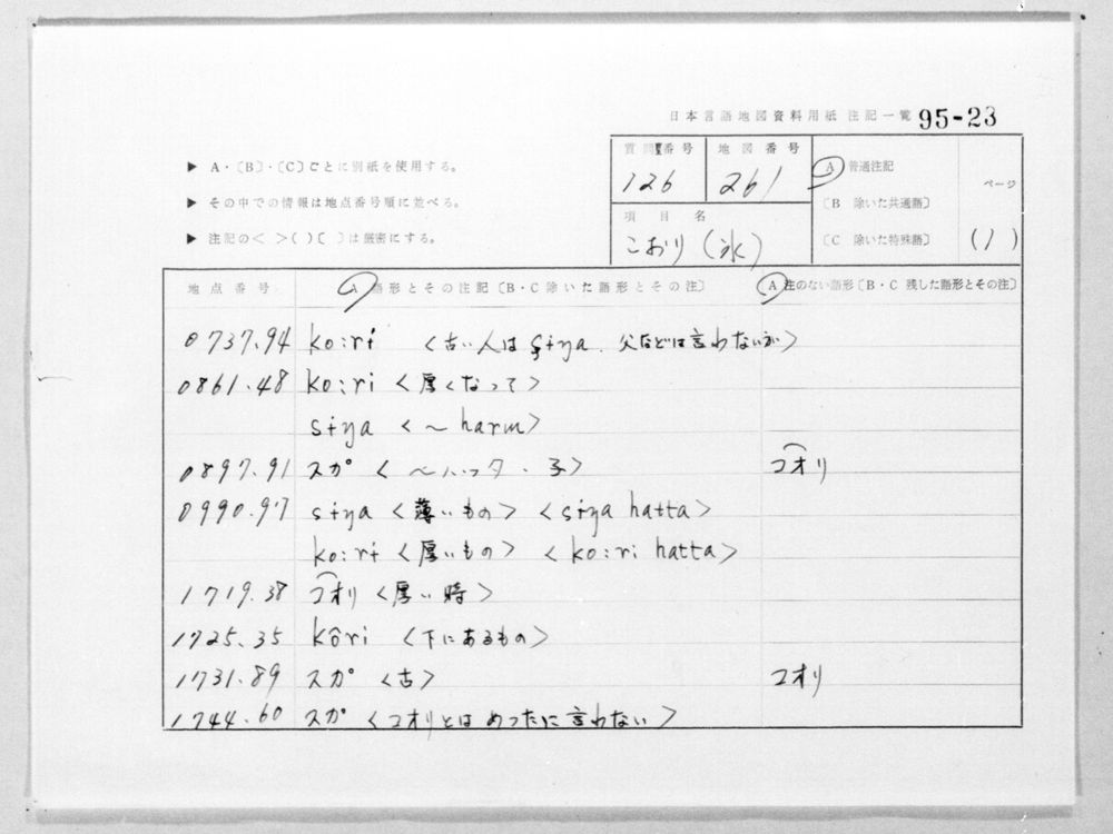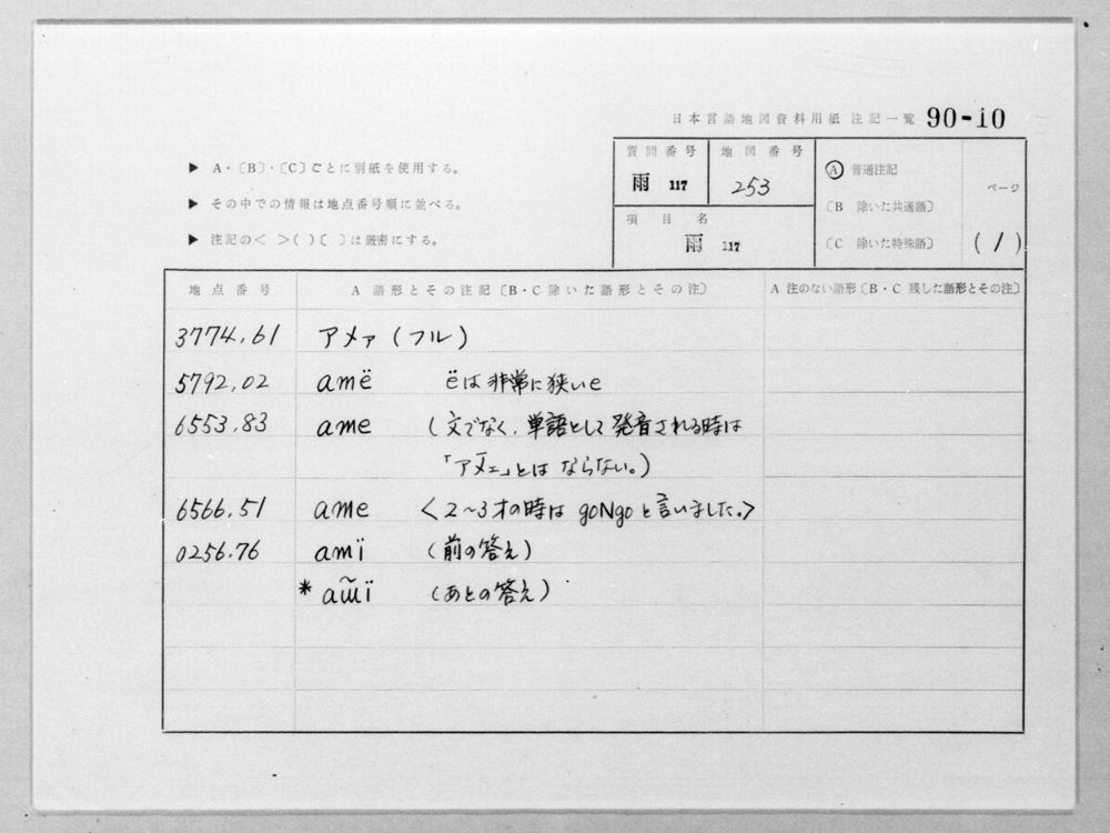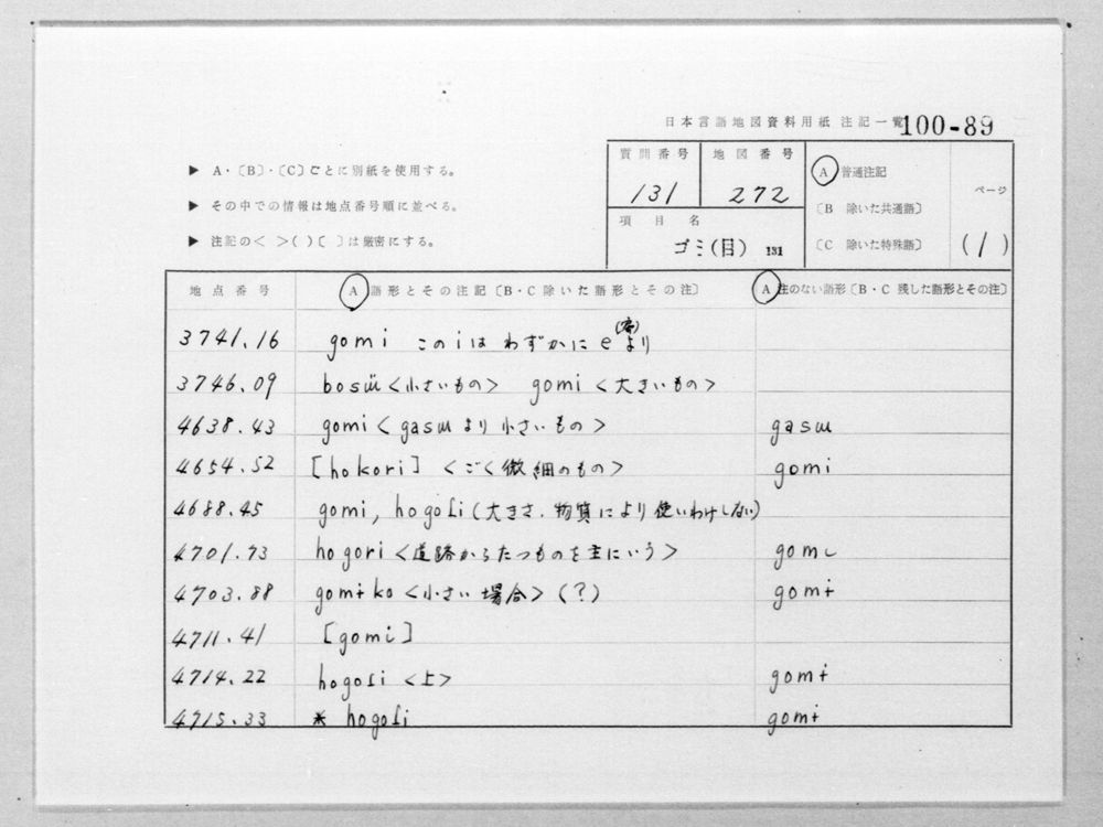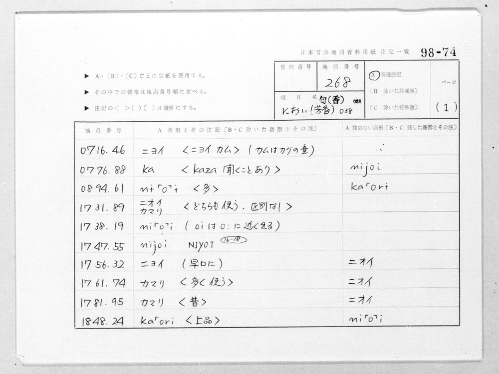 注記一覧は『日本言語地図』全6巻(1966〜1974年刊行)の編集作業と平行して作成された。その後、独立行政法人国立国語研究所において各種報告書・研究資料の電子化事業が実施され(2001〜2005年)、その一環として注記一覧のデジタル撮影が行われ、PDFが公開された。当時のデジタル撮影画像を利用して、今般IIIF化を実現するに至った。なお、注記一覧の原紙は製本され、国立国語研究所研究図書室の蔵書として閲覧利用に供されている。