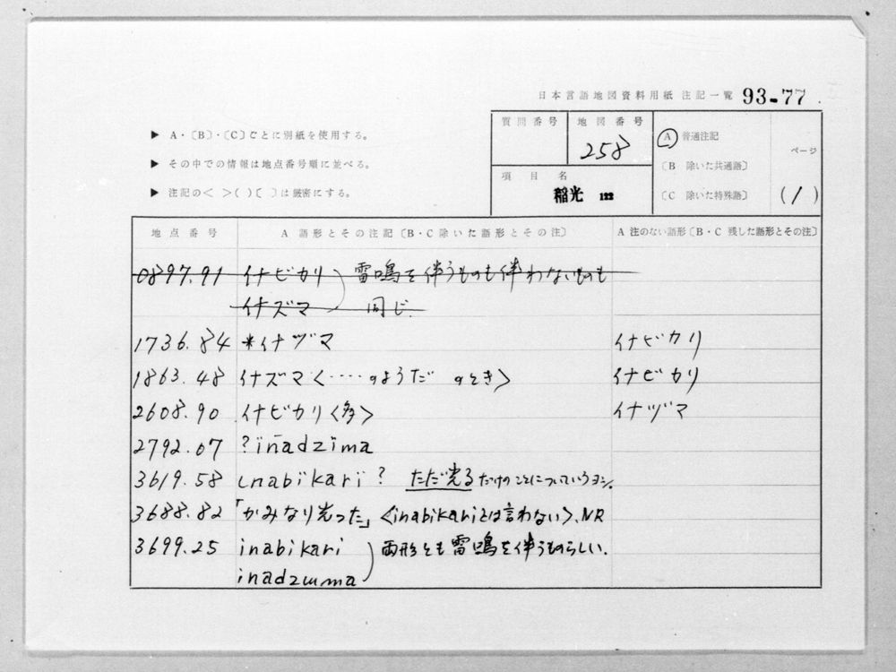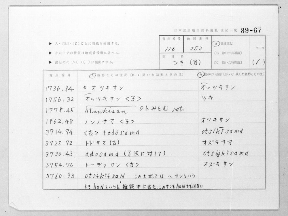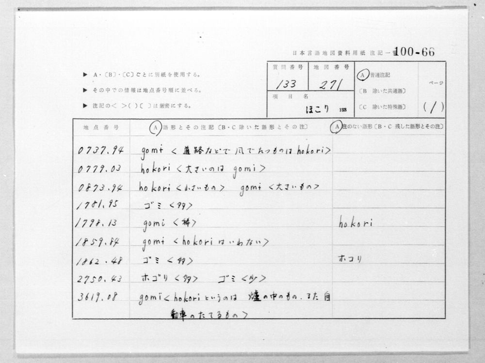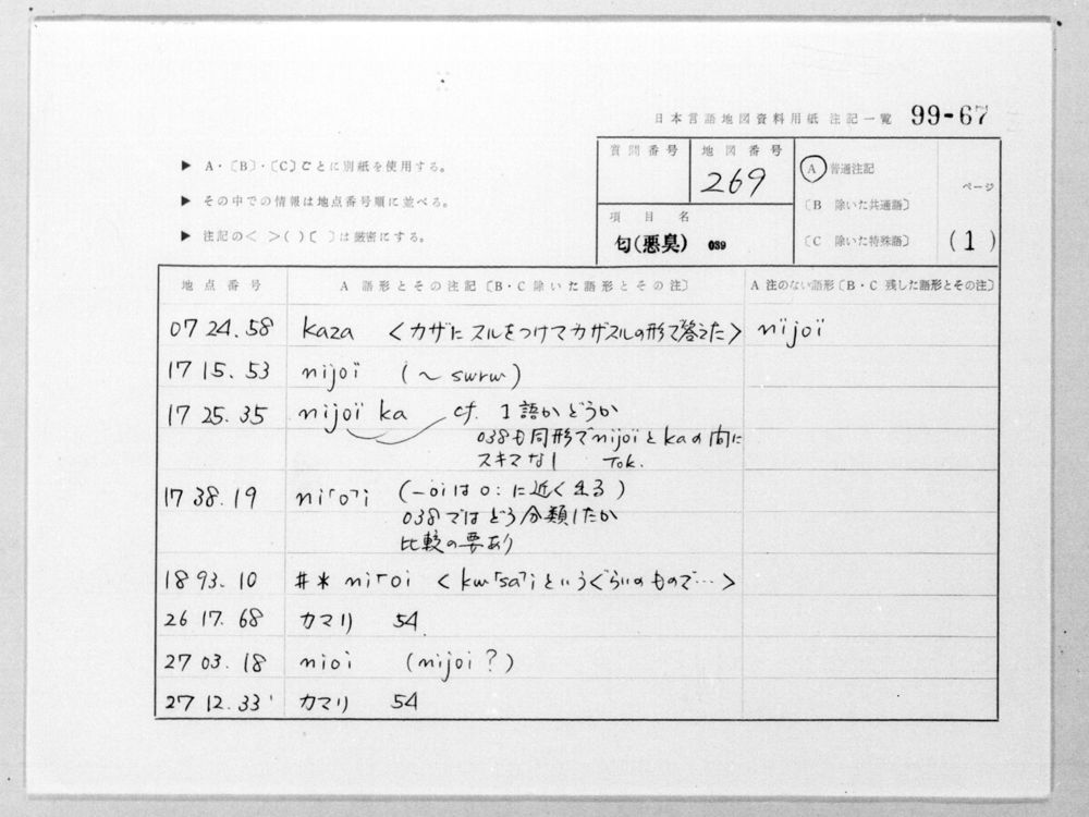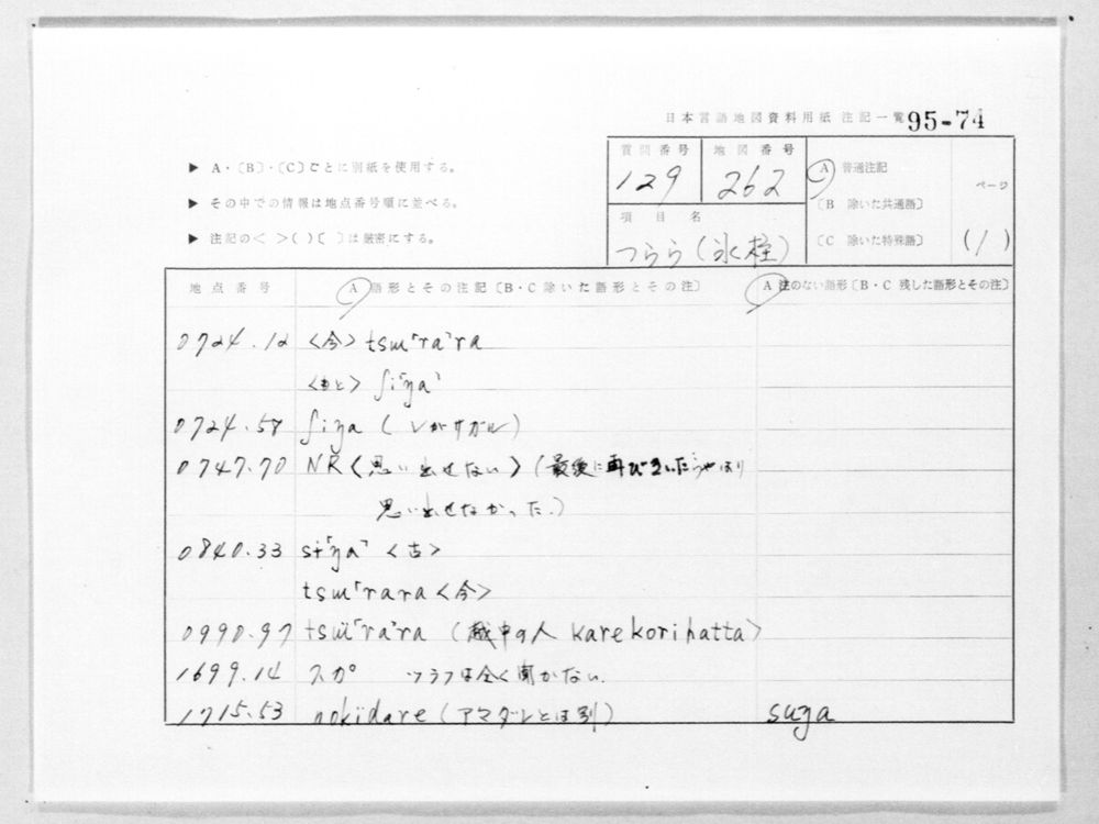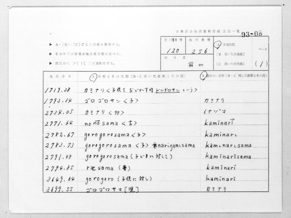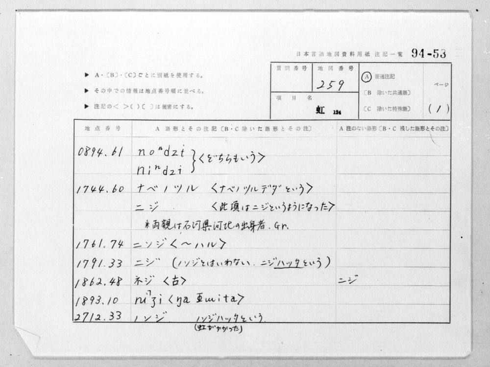 注記一覧は『日本言語地図』全6巻(1966〜1974年刊行)の編集作業と平行して作成された。その後、独立行政法人国立国語研究所において各種報告書・研究資料の電子化事業が実施され(2001〜2005年)、その一環として注記一覧のデジタル撮影が行われ、PDFが公開された。当時のデジタル撮影画像を利用して、今般IIIF化を実現するに至った。なお、注記一覧の原紙は製本され、国立国語研究所研究図書室の蔵書として閲覧利用に供されている。