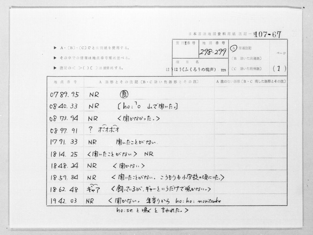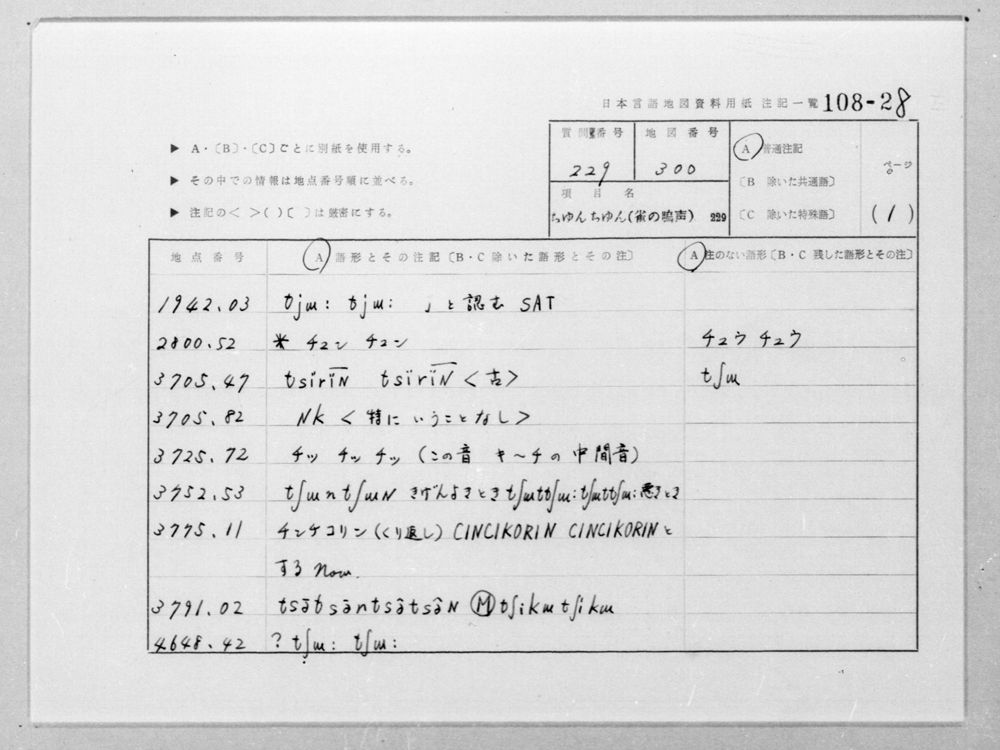 注記一覧は『日本言語地図』全6巻(1966〜1974年刊行)の編集作業と平行して作成された。その後、独立行政法人国立国語研究所において各種報告書・研究資料の電子化事業が実施され(2001〜2005年)、その一環として注記一覧のデジタル撮影が行われ、PDFが公開された。当時のデジタル撮影画像を利用して、今般IIIF化を実現するに至った。なお、注記一覧の原紙は製本され、国立国語研究所研究図書室の蔵書として閲覧利用に供されている。
