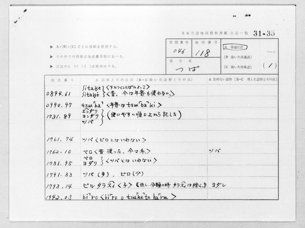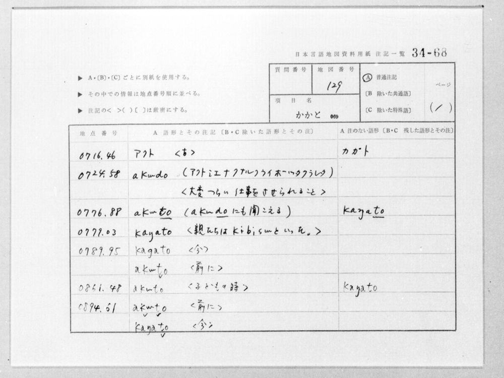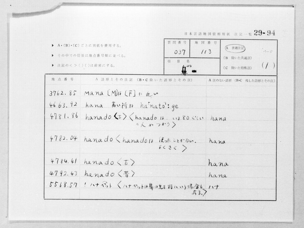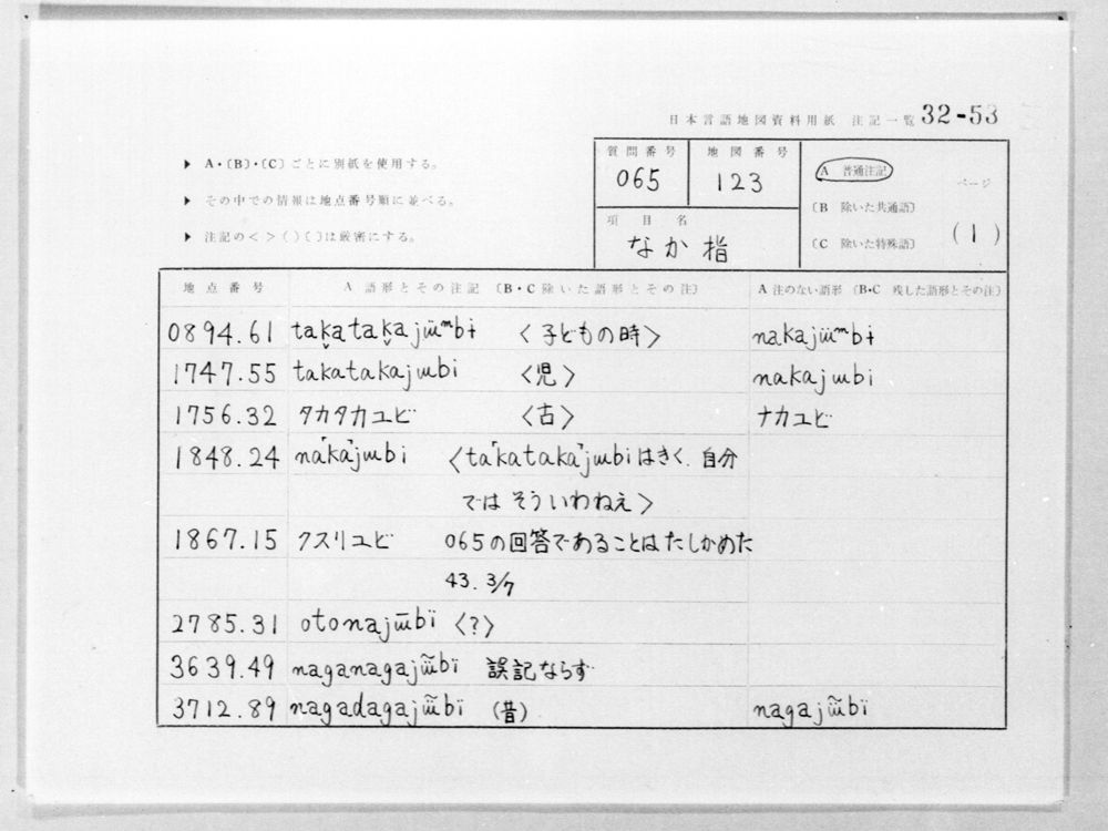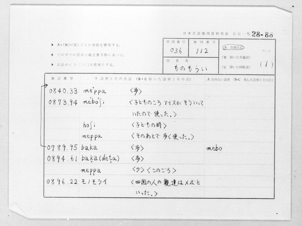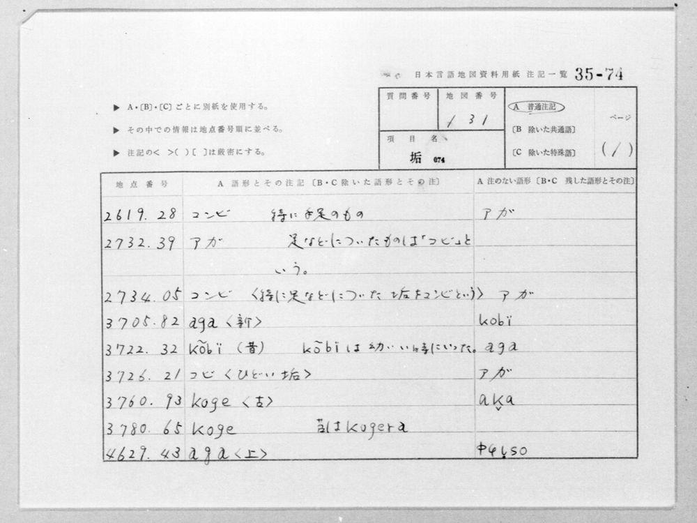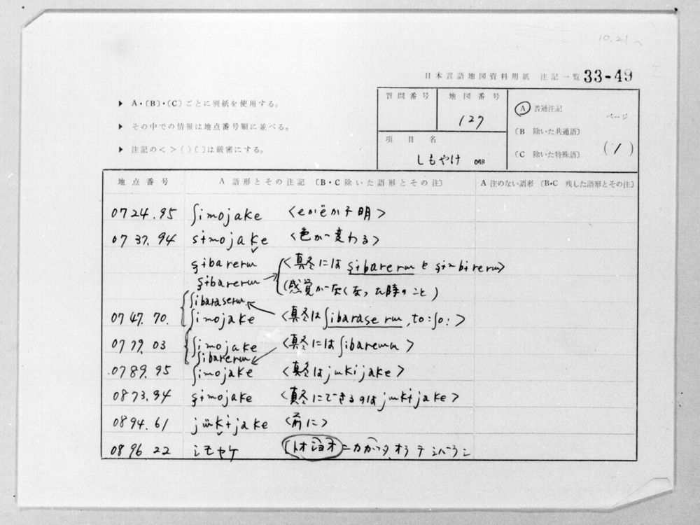 注記一覧は『日本言語地図』全6巻(1966〜1974年刊行)の編集作業と平行して作成された。その後、独立行政法人国立国語研究所において各種報告書・研究資料の電子化事業が実施され(2001〜2005年)、その一環として注記一覧のデジタル撮影が行われ、PDFが公開された。当時のデジタル撮影画像を利用して、今般IIIF化を実現するに至った。なお、注記一覧の原紙は製本され、国立国語研究所研究図書室の蔵書として閲覧利用に供されている。