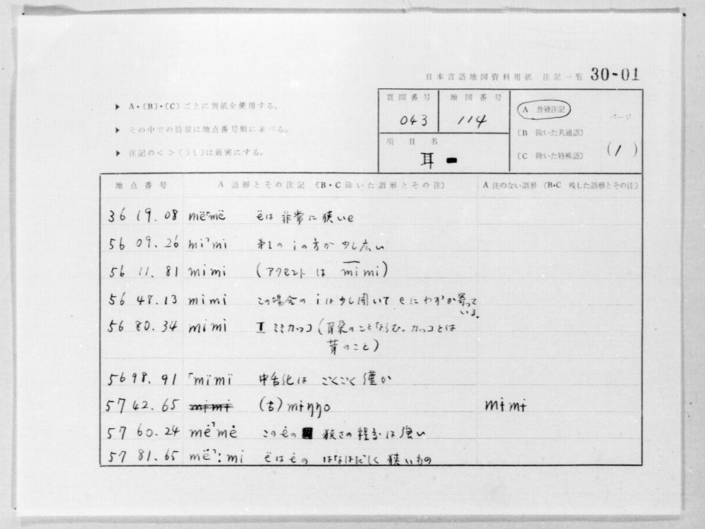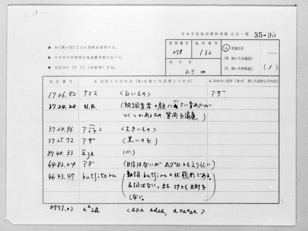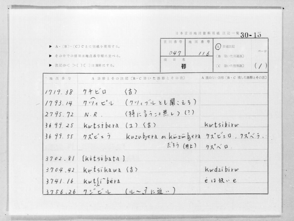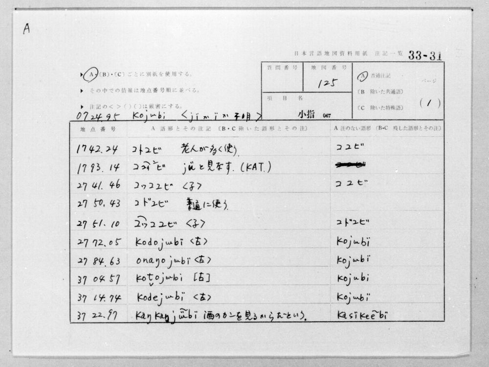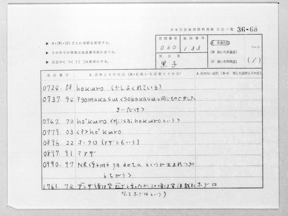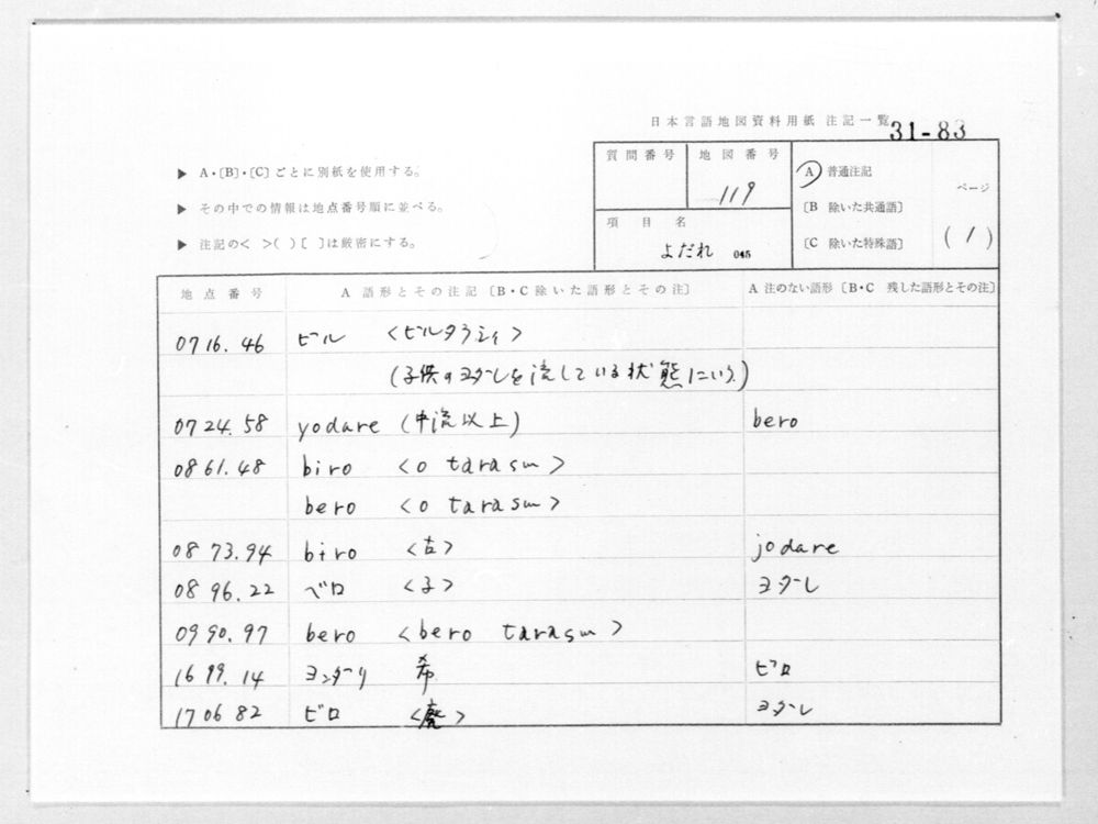 注記一覧は『日本言語地図』全6巻(1966〜1974年刊行)の編集作業と平行して作成された。その後、独立行政法人国立国語研究所において各種報告書・研究資料の電子化事業が実施され(2001〜2005年)、その一環として注記一覧のデジタル撮影が行われ、PDFが公開された。当時のデジタル撮影画像を利用して、今般IIIF化を実現するに至った。なお、注記一覧の原紙は製本され、国立国語研究所研究図書室の蔵書として閲覧利用に供されている。