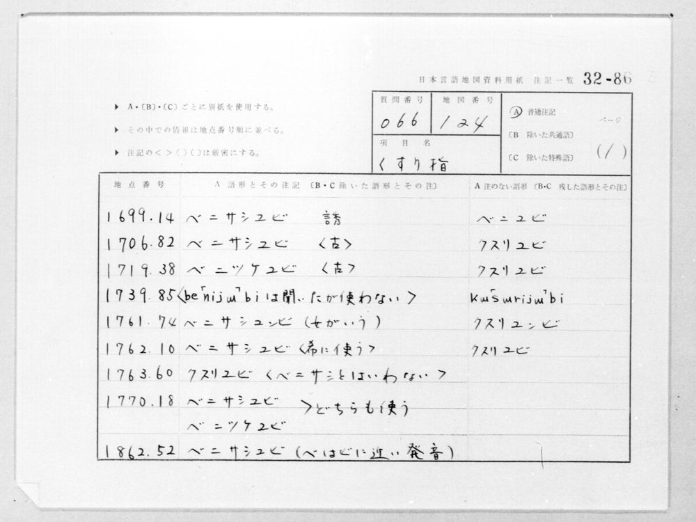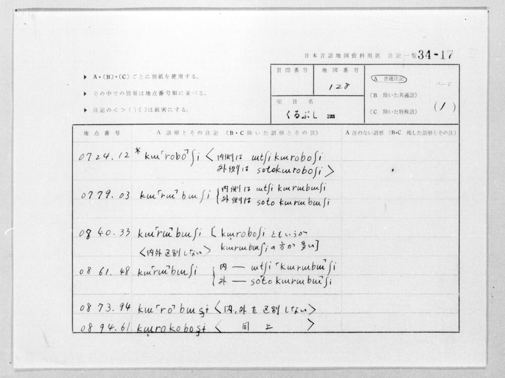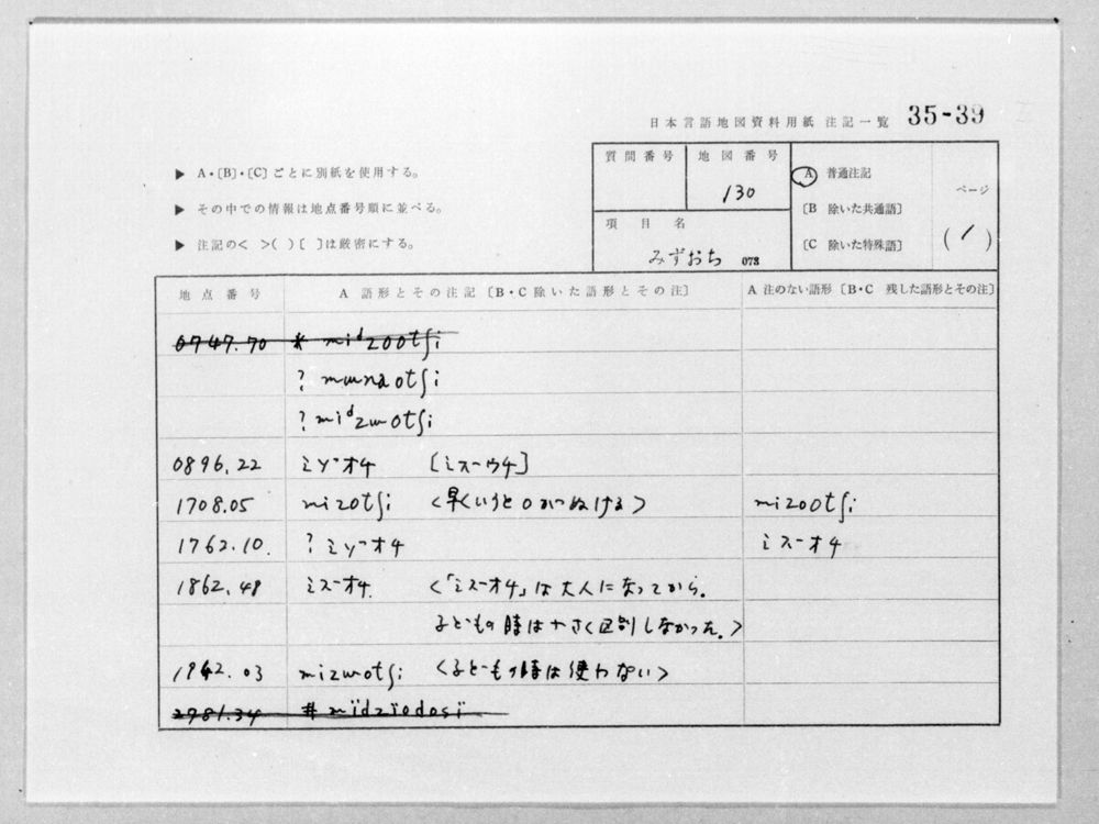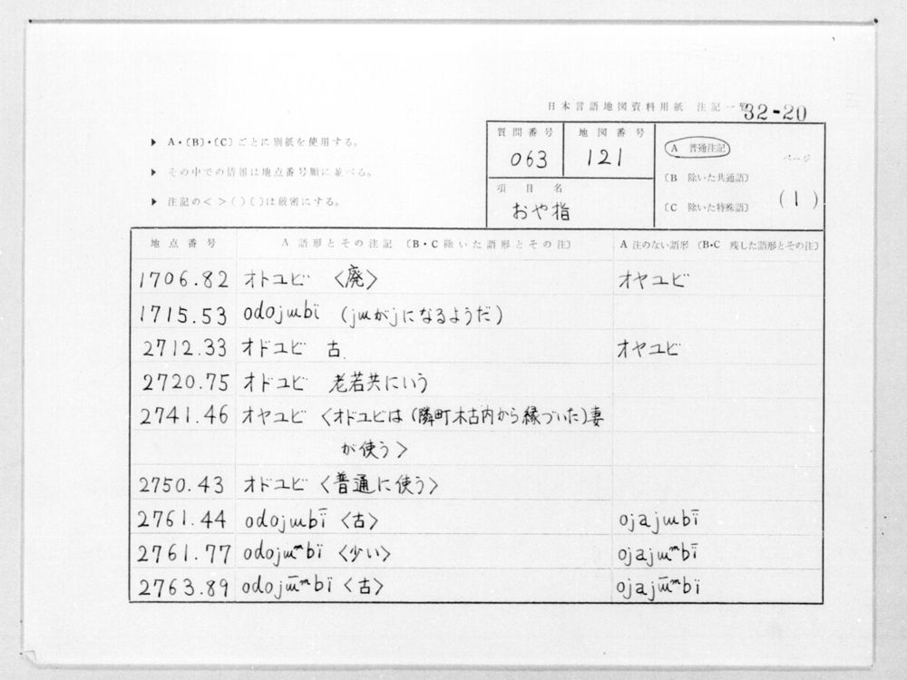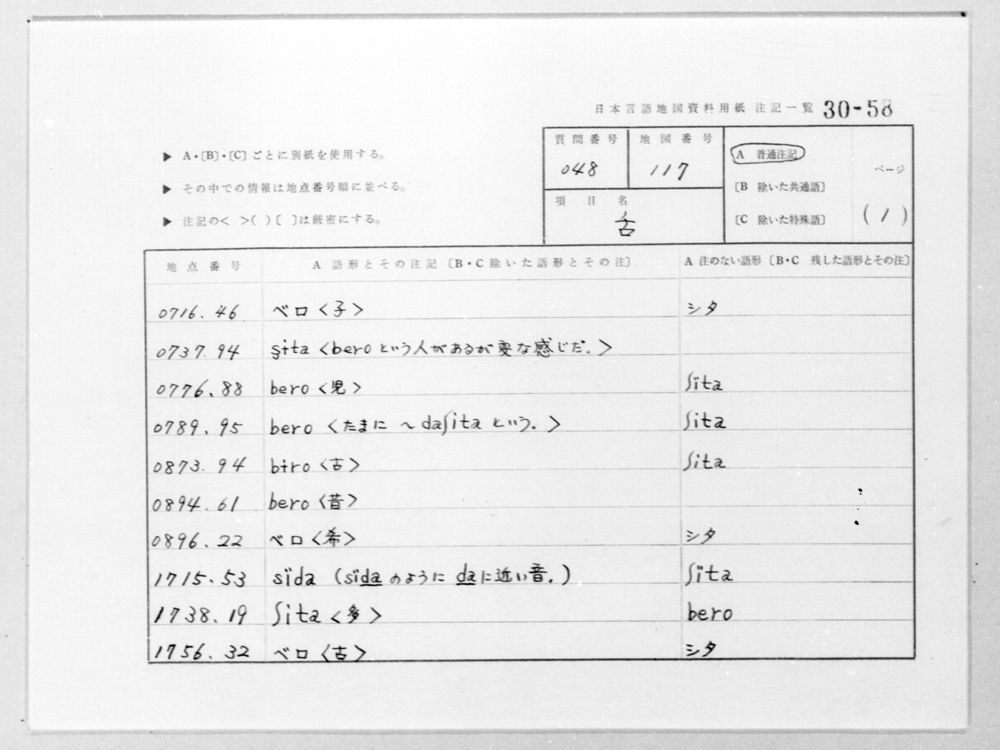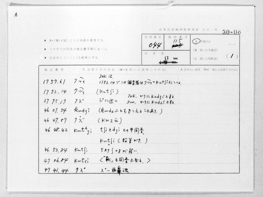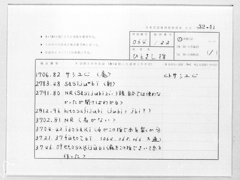 注記一覧は『日本言語地図』全6巻(1966〜1974年刊行)の編集作業と平行して作成された。その後、独立行政法人国立国語研究所において各種報告書・研究資料の電子化事業が実施され(2001〜2005年)、その一環として注記一覧のデジタル撮影が行われ、PDFが公開された。当時のデジタル撮影画像を利用して、今般IIIF化を実現するに至った。なお、注記一覧の原紙は製本され、国立国語研究所研究図書室の蔵書として閲覧利用に供されている。