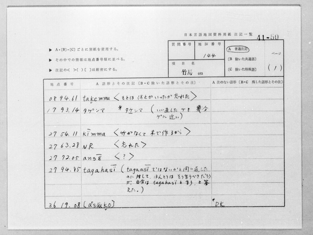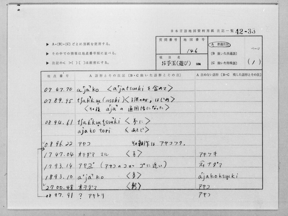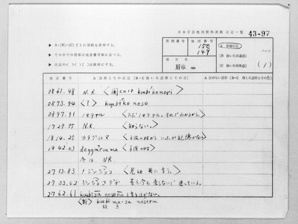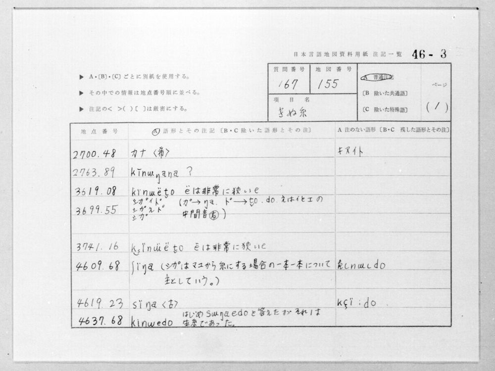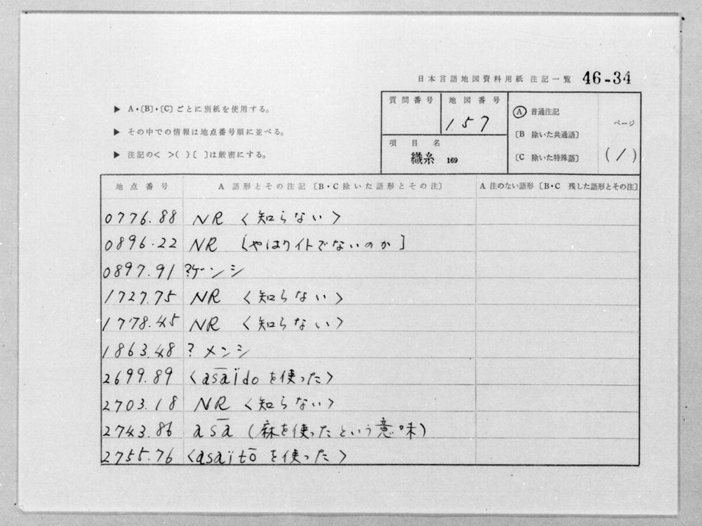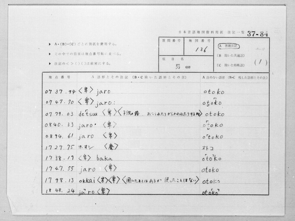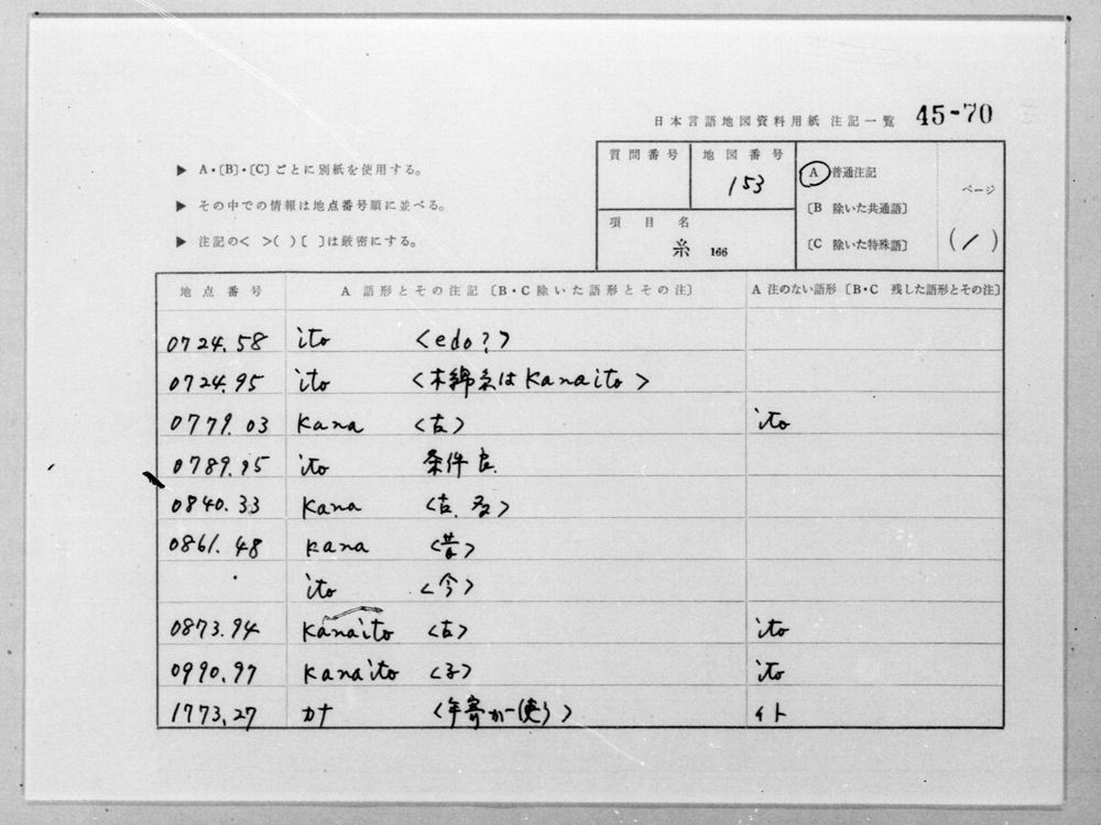 注記一覧は『日本言語地図』全6巻(1966〜1974年刊行)の編集作業と平行して作成された。その後、独立行政法人国立国語研究所において各種報告書・研究資料の電子化事業が実施され(2001〜2005年)、その一環として注記一覧のデジタル撮影が行われ、PDFが公開された。当時のデジタル撮影画像を利用して、今般IIIF化を実現するに至った。なお、注記一覧の原紙は製本され、国立国語研究所研究図書室の蔵書として閲覧利用に供されている。