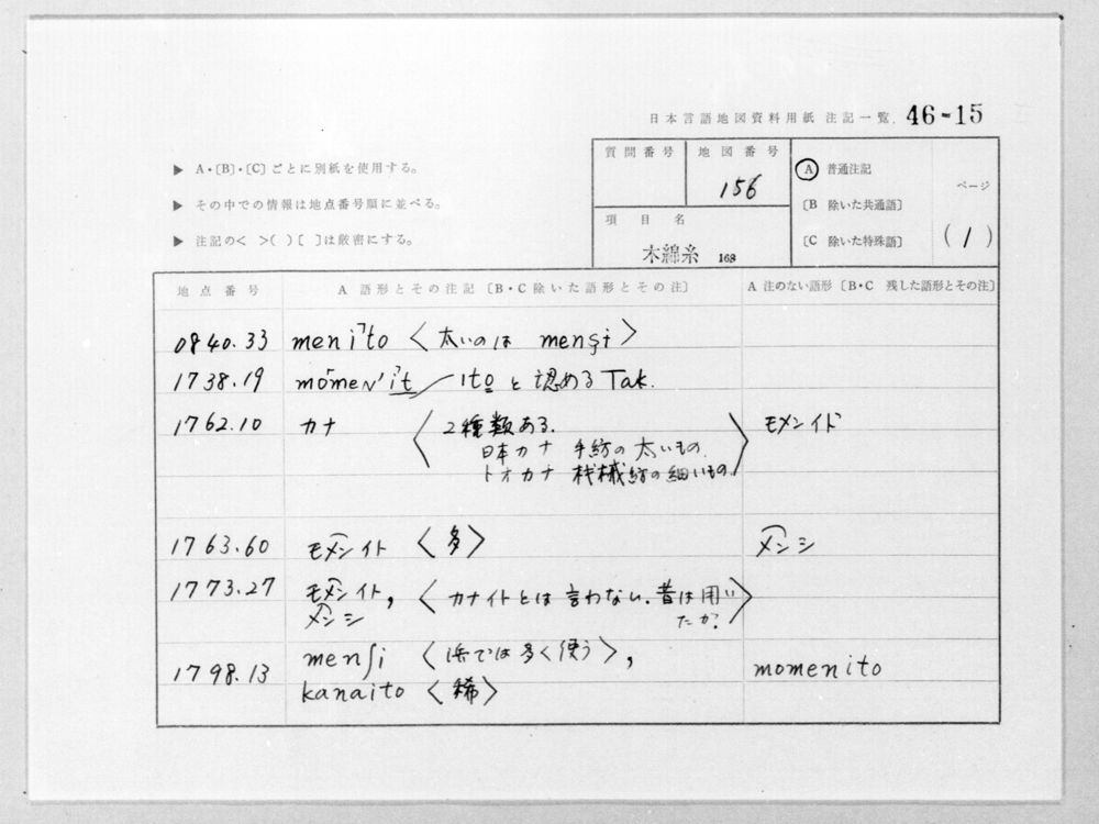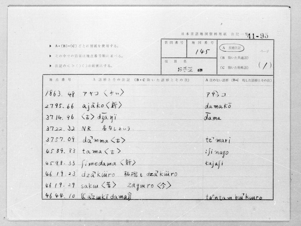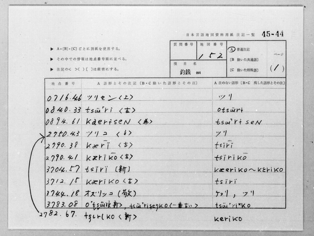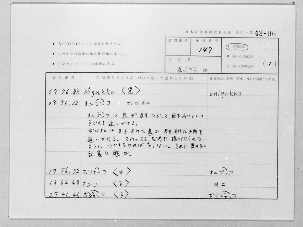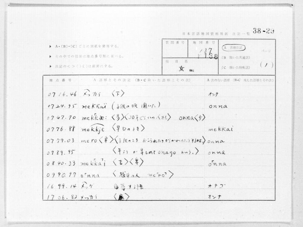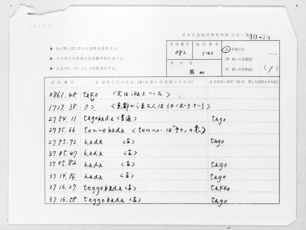 注記一覧は『日本言語地図』全6巻(1966〜1974年刊行)の編集作業と平行して作成された。その後、独立行政法人国立国語研究所において各種報告書・研究資料の電子化事業が実施され(2001〜2005年)、その一環として注記一覧のデジタル撮影が行われ、PDFが公開された。当時のデジタル撮影画像を利用して、今般IIIF化を実現するに至った。なお、注記一覧の原紙は製本され、国立国語研究所研究図書室の蔵書として閲覧利用に供されている。