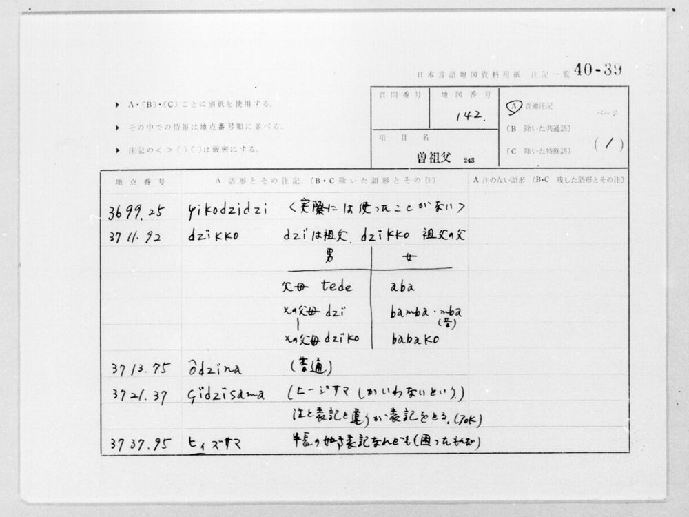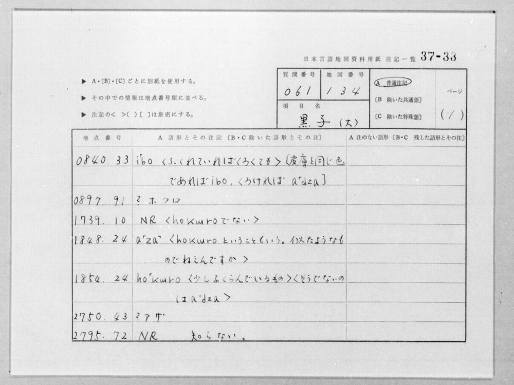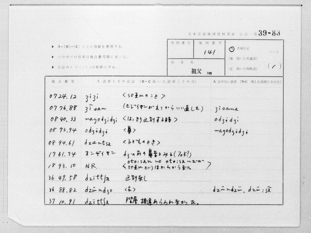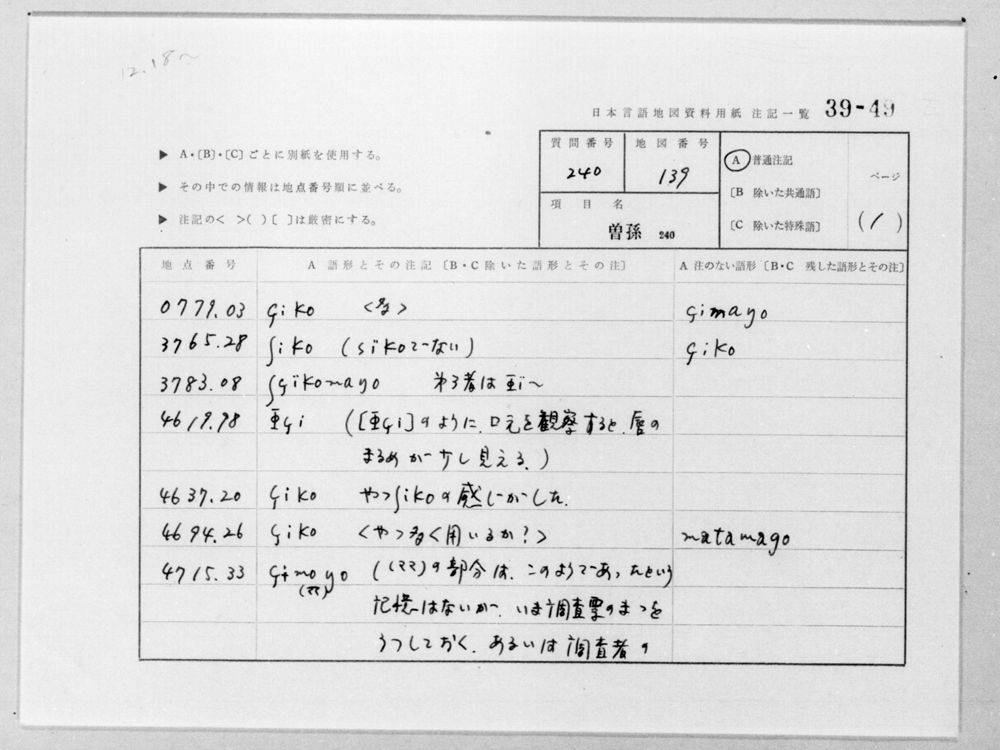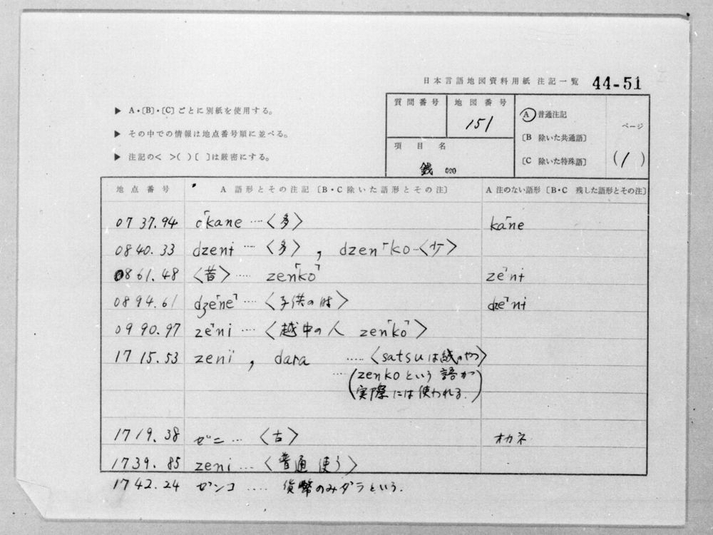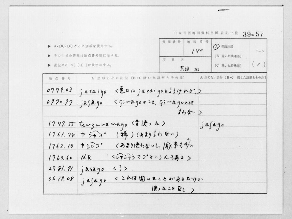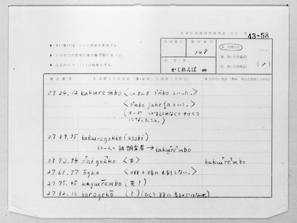 注記一覧は『日本言語地図』全6巻(1966〜1974年刊行)の編集作業と平行して作成された。その後、独立行政法人国立国語研究所において各種報告書・研究資料の電子化事業が実施され(2001〜2005年)、その一環として注記一覧のデジタル撮影が行われ、PDFが公開された。当時のデジタル撮影画像を利用して、今般IIIF化を実現するに至った。なお、注記一覧の原紙は製本され、国立国語研究所研究図書室の蔵書として閲覧利用に供されている。