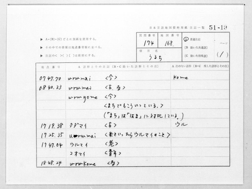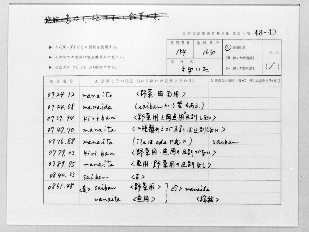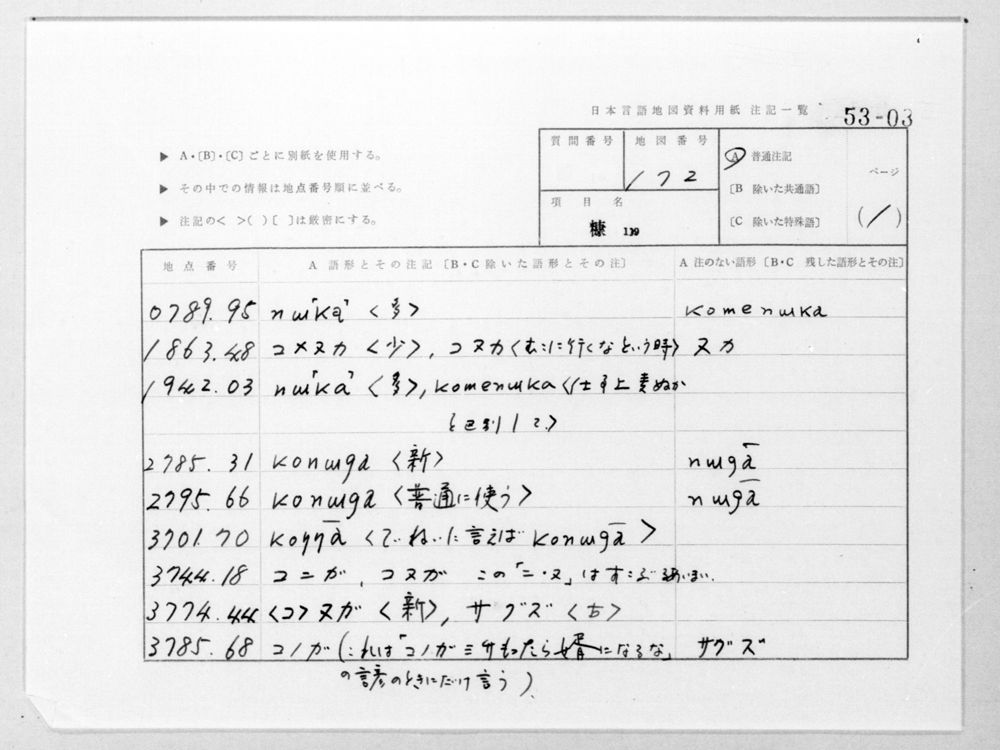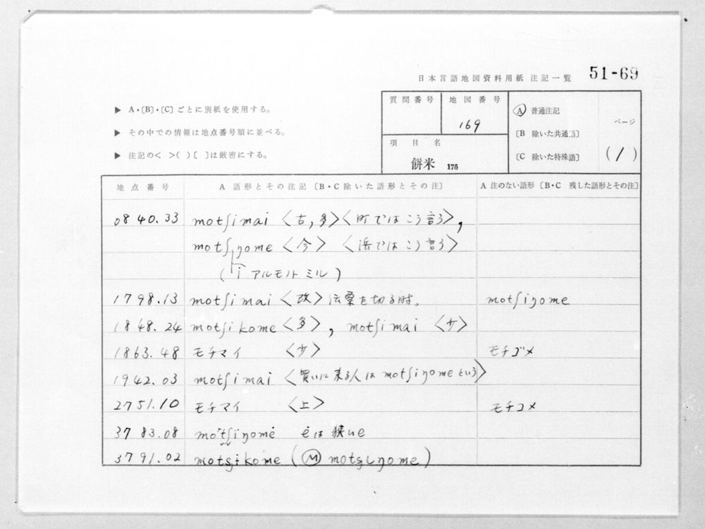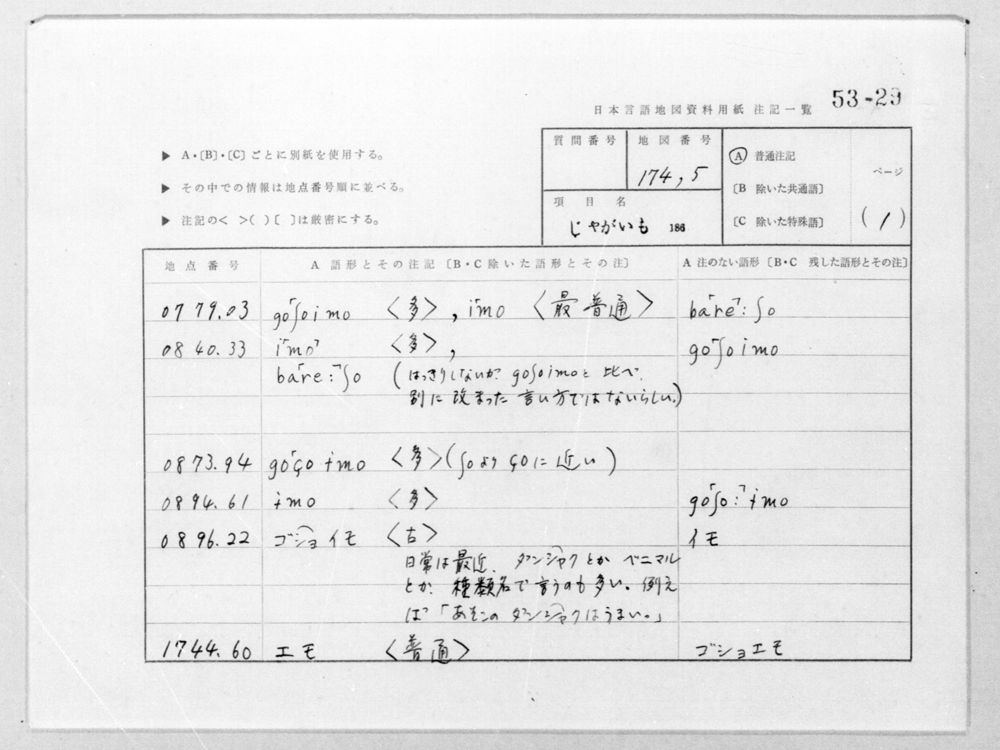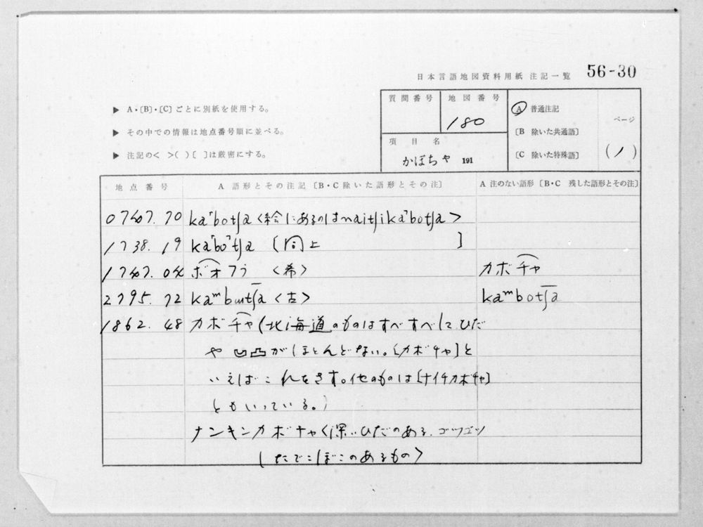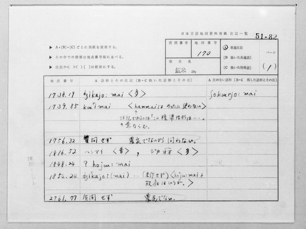 注記一覧は『日本言語地図』全6巻(1966〜1974年刊行)の編集作業と平行して作成された。その後、独立行政法人国立国語研究所において各種報告書・研究資料の電子化事業が実施され(2001〜2005年)、その一環として注記一覧のデジタル撮影が行われ、PDFが公開された。当時のデジタル撮影画像を利用して、今般IIIF化を実現するに至った。なお、注記一覧の原紙は製本され、国立国語研究所研究図書室の蔵書として閲覧利用に供されている。