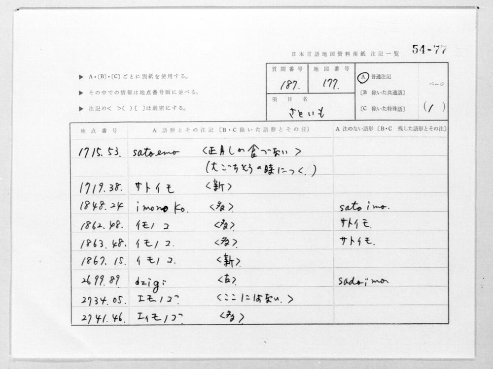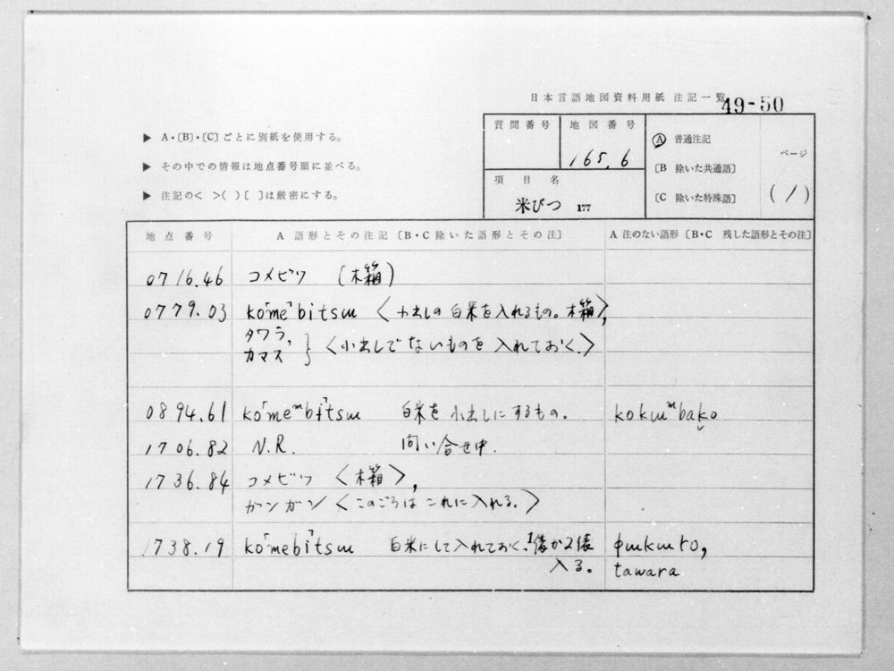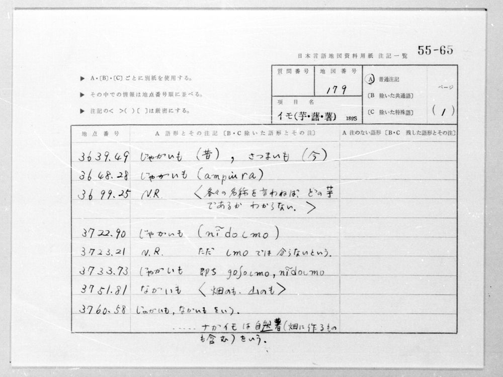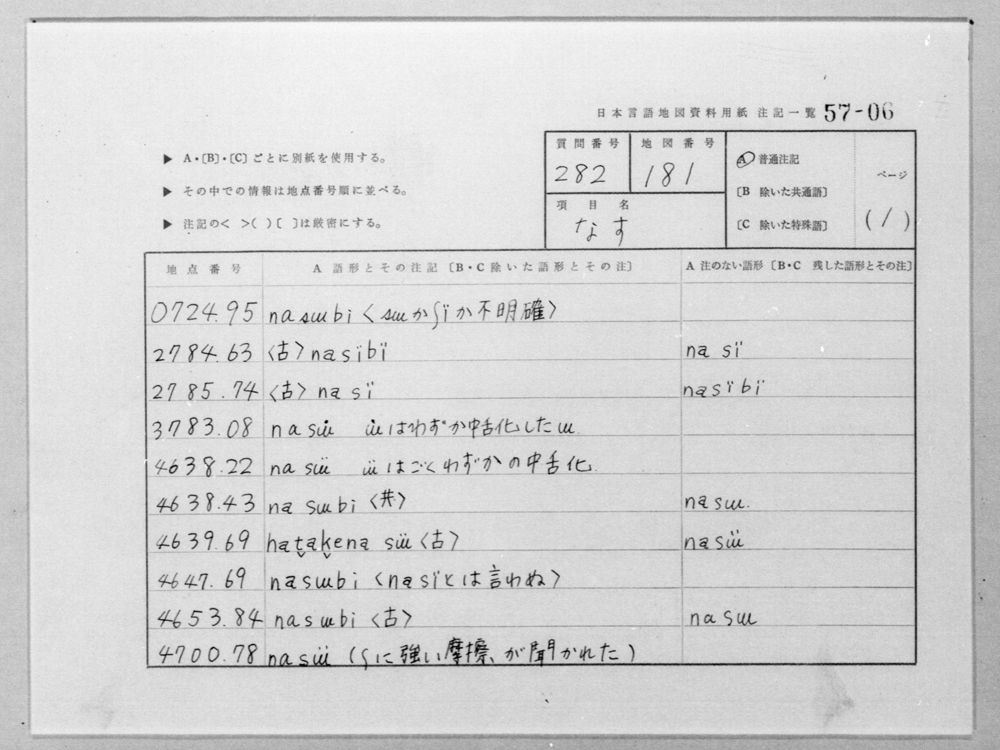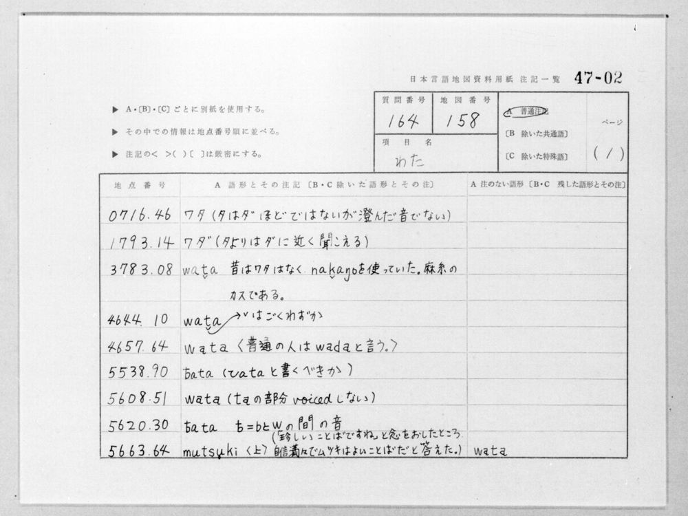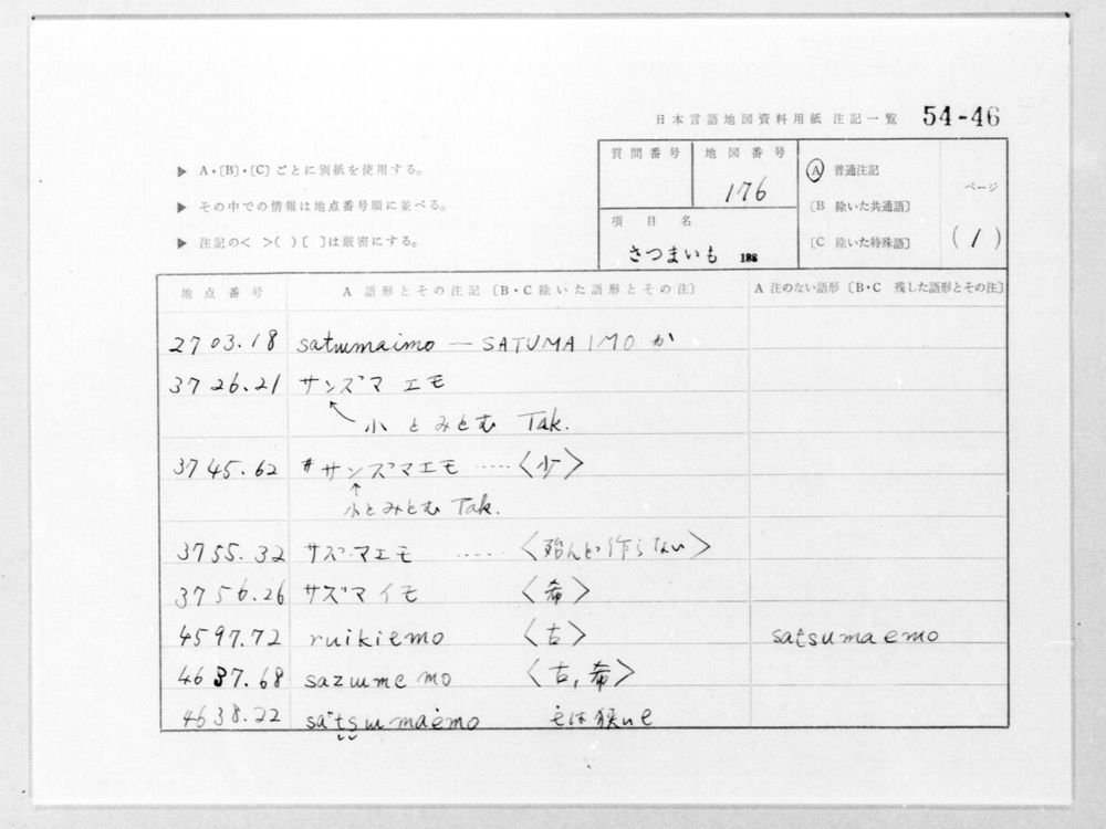 注記一覧は『日本言語地図』全6巻(1966〜1974年刊行)の編集作業と平行して作成された。その後、独立行政法人国立国語研究所において各種報告書・研究資料の電子化事業が実施され(2001〜2005年)、その一環として注記一覧のデジタル撮影が行われ、PDFが公開された。当時のデジタル撮影画像を利用して、今般IIIF化を実現するに至った。なお、注記一覧の原紙は製本され、国立国語研究所研究図書室の蔵書として閲覧利用に供されている。