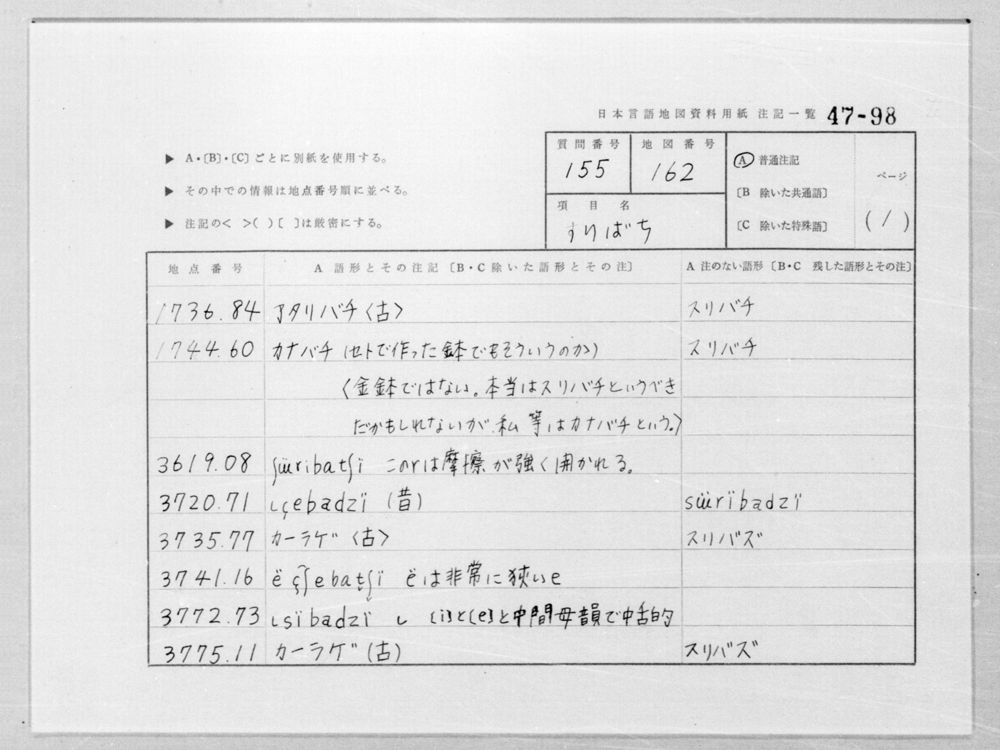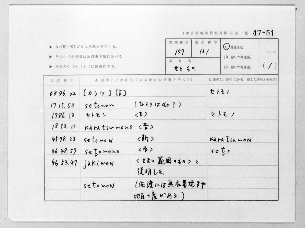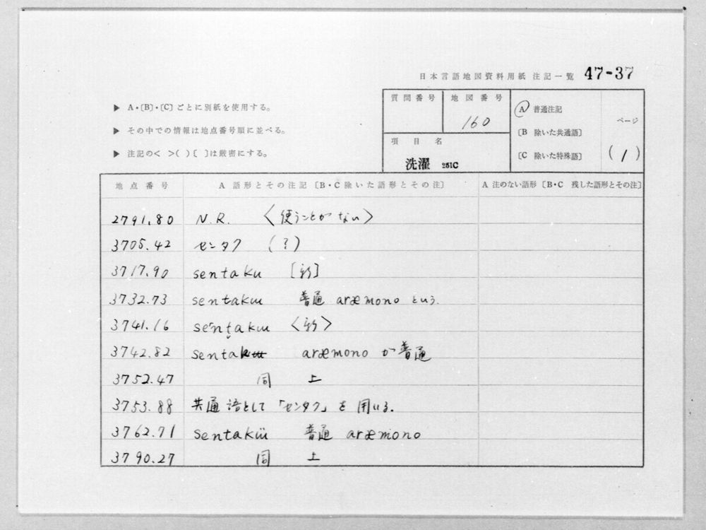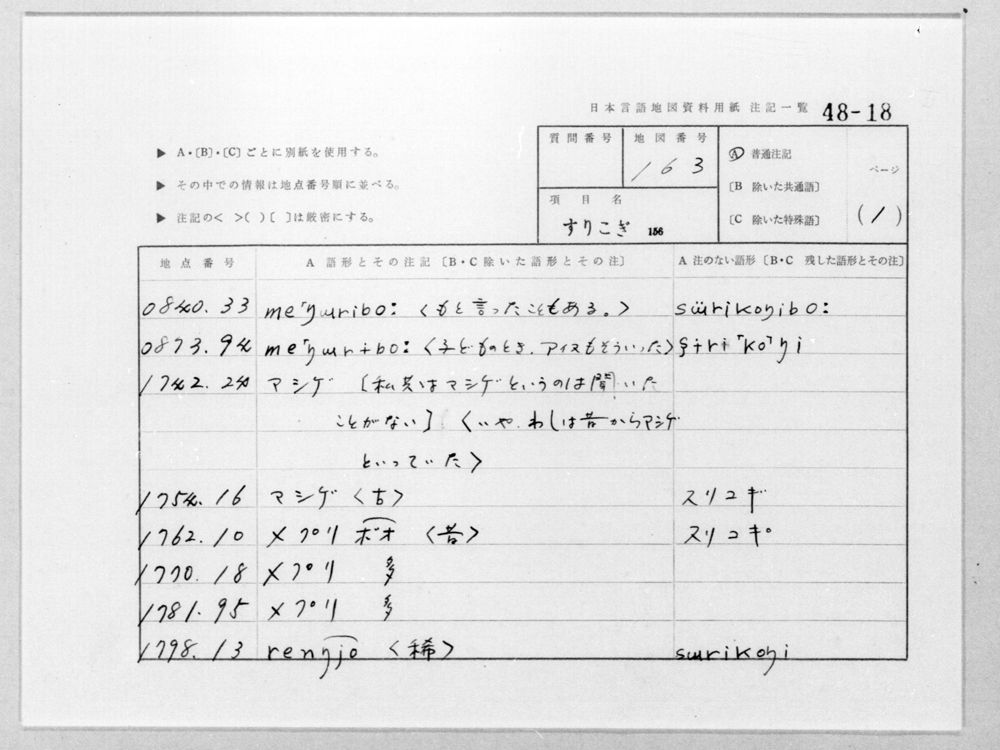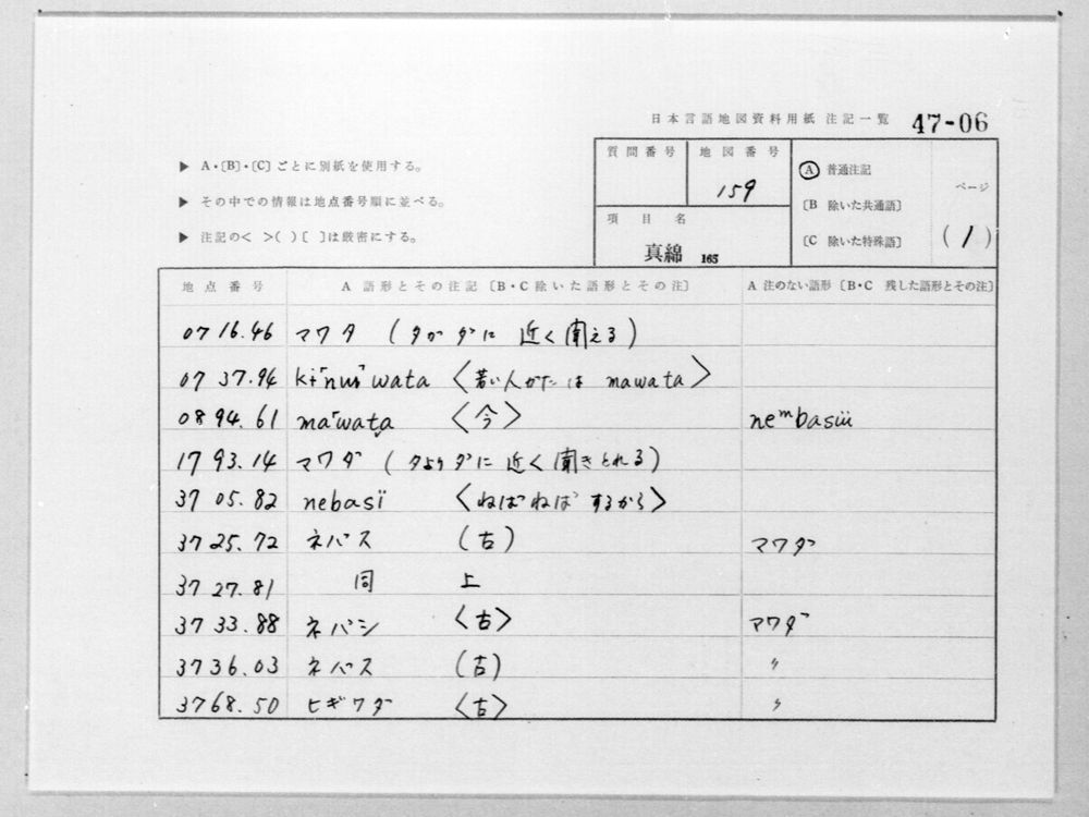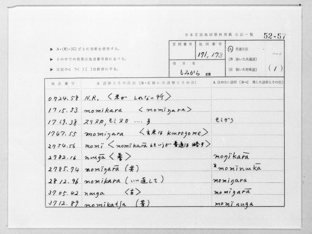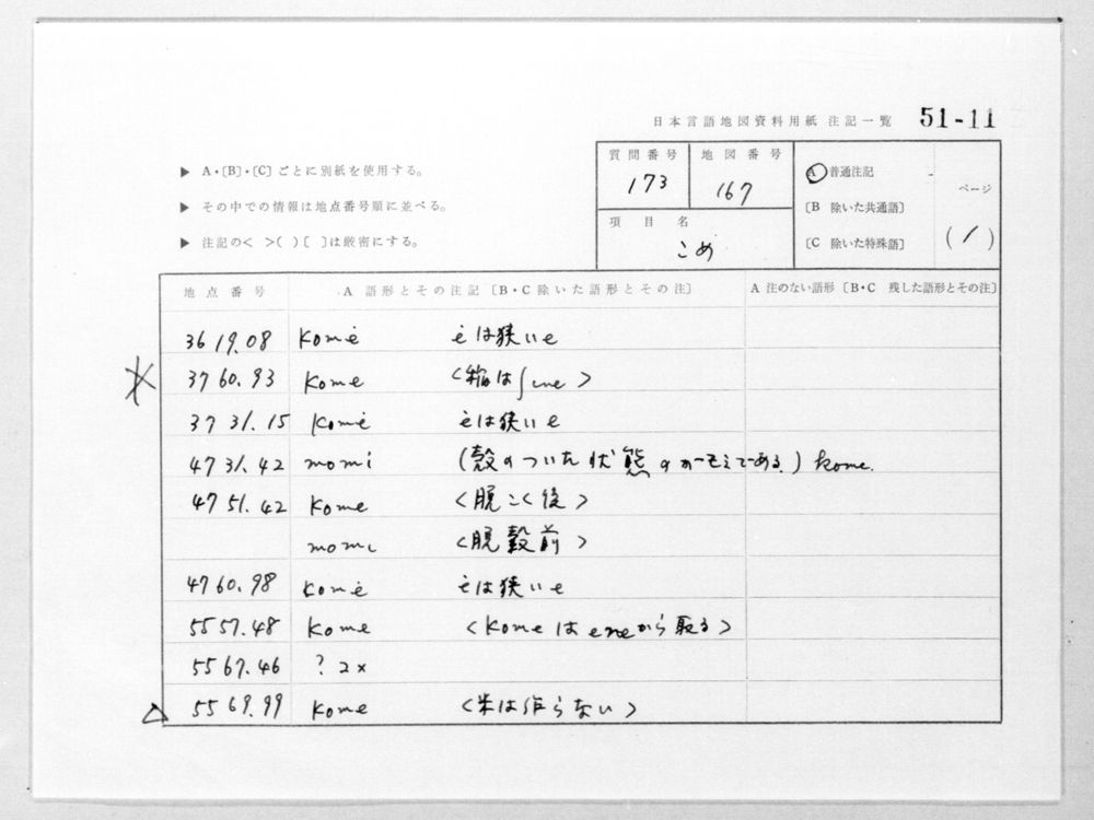 注記一覧は『日本言語地図』全6巻(1966〜1974年刊行)の編集作業と平行して作成された。その後、独立行政法人国立国語研究所において各種報告書・研究資料の電子化事業が実施され(2001〜2005年)、その一環として注記一覧のデジタル撮影が行われ、PDFが公開された。当時のデジタル撮影画像を利用して、今般IIIF化を実現するに至った。なお、注記一覧の原紙は製本され、国立国語研究所研究図書室の蔵書として閲覧利用に供されている。